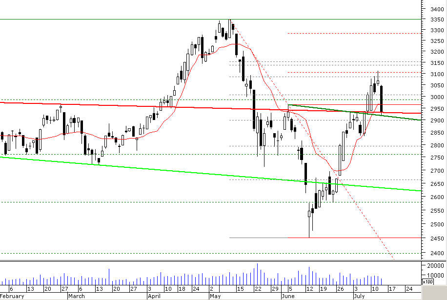 Od euforii do paniki... we wczorajszym komentarzu pisalem: "Po prognozowanym wy?szym otwarciu indeks szybkim, niemal euforycznym ruchem wyznaczyl sesyjny szczyt na poziomie 3110pt, a kontrakt FW20 - 3137. [...] Wydaje sie ze dobrym rozwiazaniem dla kontynuacji fali wzrostowej bylaby w tej chwili lekka korekta indeksu WIG20, a przynajmniej kilkusesyjny ruch w bok w zakresie 3000-3100pt", w obliczu slabej sesji w USA oraz spadkow na rynkach azjatyckich jasne stalo sie ze przynajmniej otwarcie dzisiejszej sesji bedzie na nizszym poziomie. Tak tez sie stalo, a rynek przez wieksza czesc sesji pozostawal w - nudzacej wszystkich aktywnych graczy - konsolidacji, po godzinie 14 jednak w obliczu coraz bardziej niepokojacych informacji zwiazanych z konfliktem zbrojnym Izrael-Liban, inwestorom puscily nerwy i w niemal panicznej wyprzedazy w ciagu 2 godzin FW stracily 100pt (cala sesja -154pt) osiagajac minimum na poziomie 2933pt. Minimum indeksu 2916pt, zamkniecie na wsparciu 2930pt.