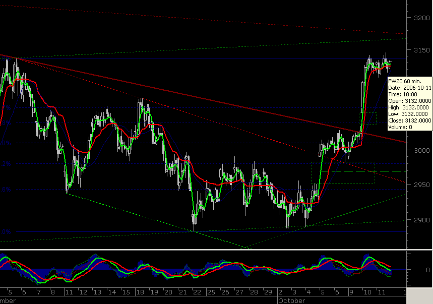 2. Sytuacja techniczna dzisiaj sie nie zmienila, zatem aktualny pozostaje ostatni komentarz Olaba: zobacz Ogladamy ruch w bok rozpoczety w drugiej czesci wczorajszej sesji. Raczej nazwalbym to konsolidacja przy szczytach - ostatni wazny szczyt na FW to 3137 i widzimy ze ten poziom sprawia powazne problemy. Waski zakres tego boczniaka/konsolidacji wskazuje na brak widocznych oznak oslabienia ostatniej fali wzrostowej.