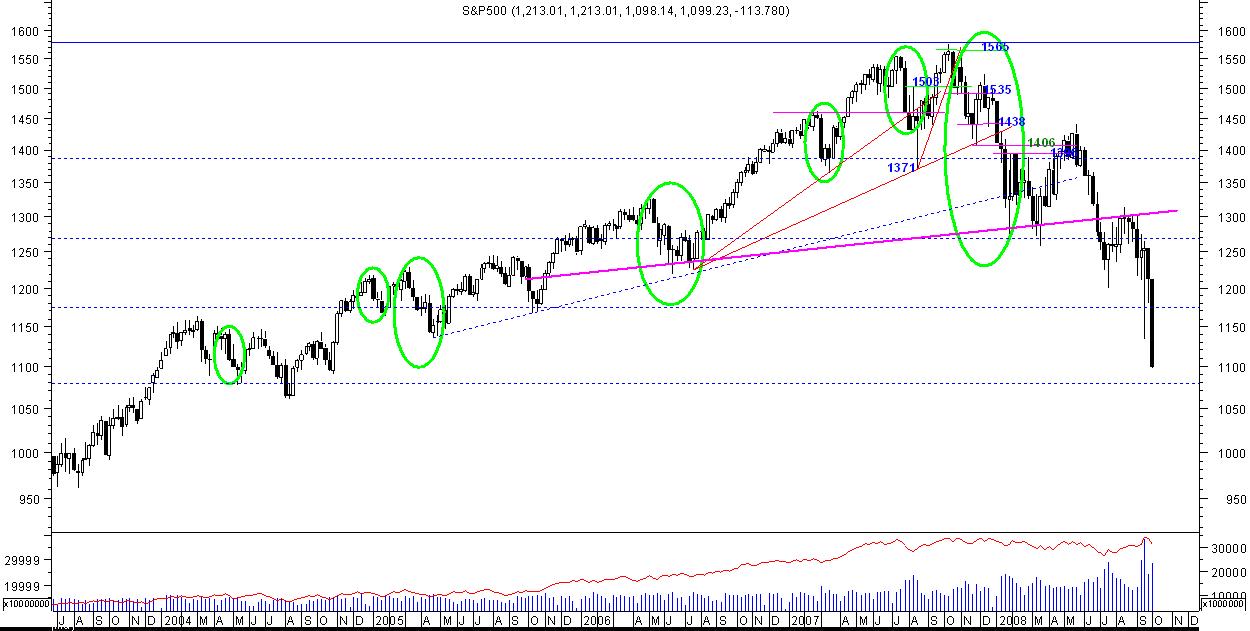Tymczasem indeksy USA wygladaja tragicznie.Najlepiej widac to na wykresach weekly i monthly. Spadki nabieraja dynamiki, a struktura fal podpowiada, ze mozemy robic najbardziej dynamiczna fale 3 w 3 (w optymistycznej wersji 3 w C). Ponadto warto luknac, jak rynek usa zachowywal sie w przeszlosci po dlugich czarnych swiecach weekly. Wniosek jest smutny - nawet w przypadku odbicia, za tydzien i tak bedziemy testowac obecne poziomy.