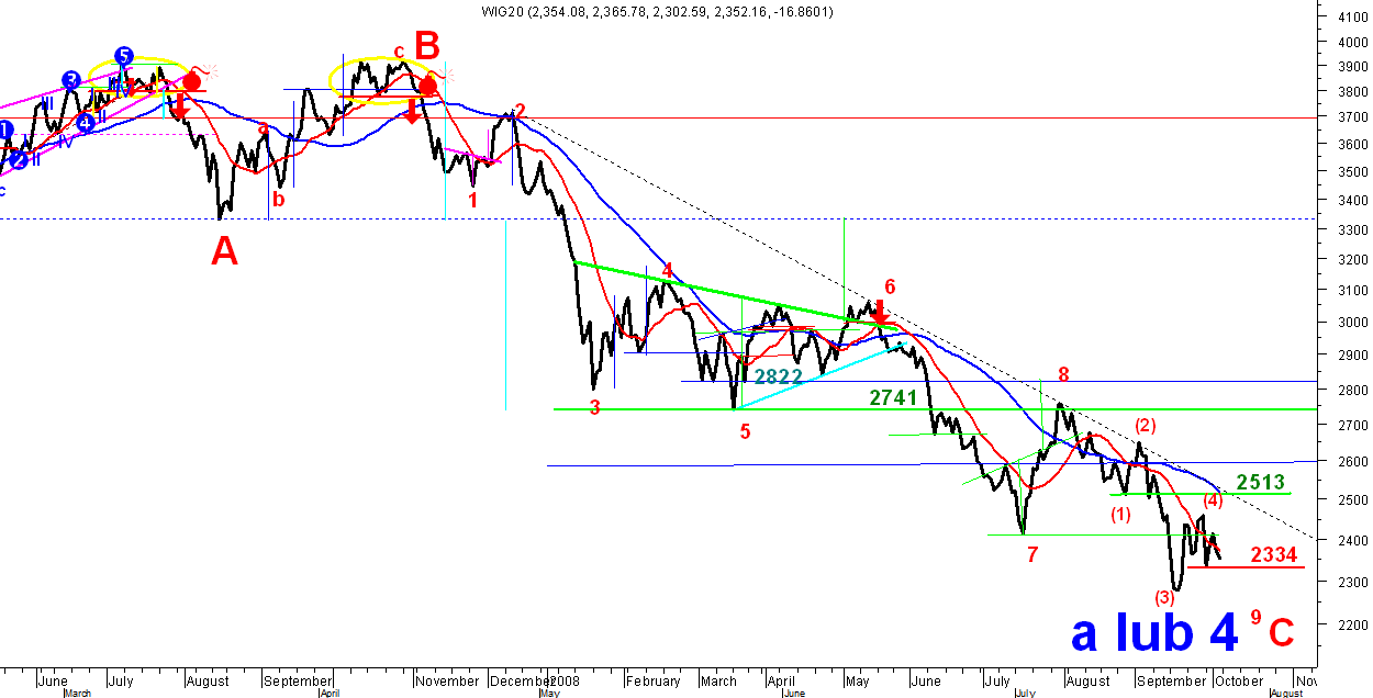 Wydaje mi sie ze zaczelismy podfale nr5 w 3 w C.Wyglada na to ze podfala 4 to byla korekta pedzaca 3-3-5.Teraz zjazd do 2080pkt i odbicie.A potem w listopadzie ostatnia 5 fala zapchnie indeks ponizej 2000pkt i skonczy sie bessa.To by sie pokrywalo z przepowiedniami Jackowskiego ze w listopadzie zwala.