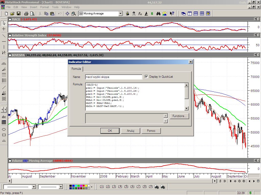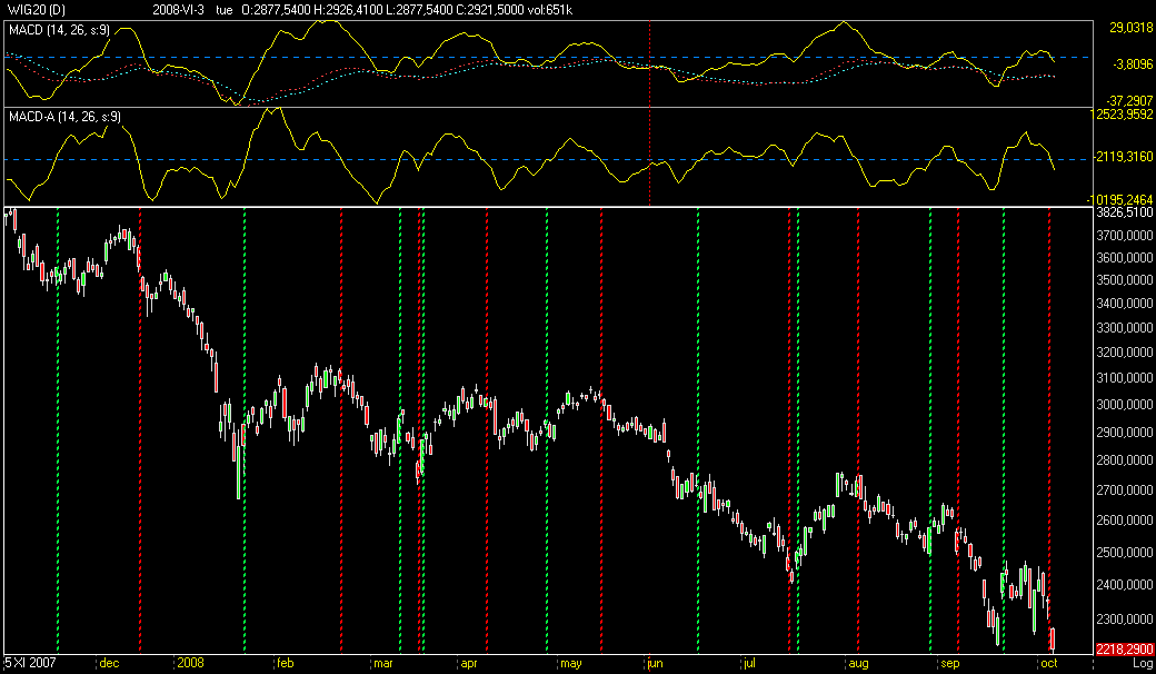 Zaznaczyłem na wykresie najprostsza interpretację - przeciecia zera dla MACD-A