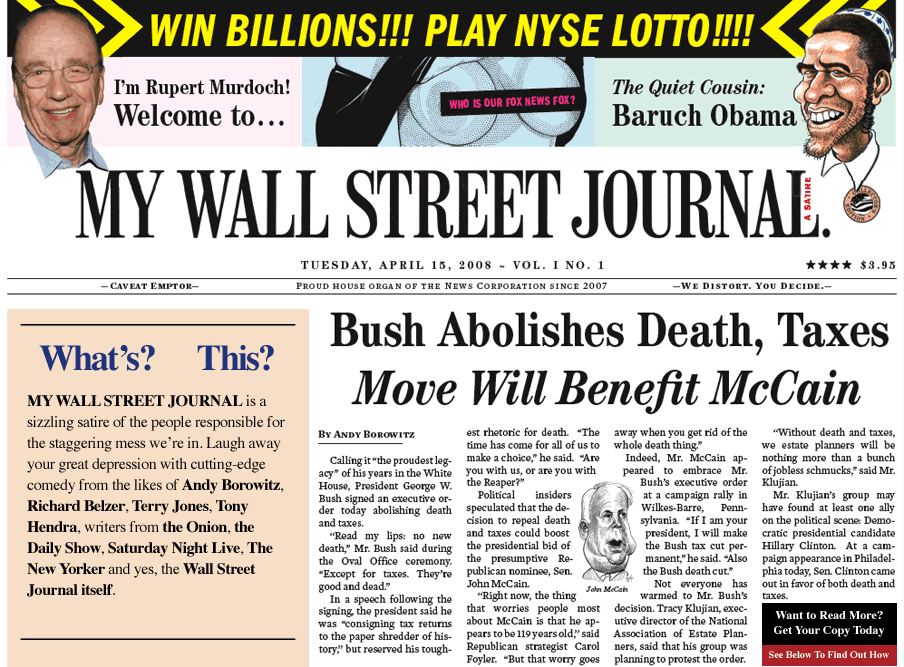 Czołówka o dekrecie prezydenta Busha znoszącym śmierć i podatki oraz karykatura prawicowej publicystki Ann Coulter topless - takie smaczki Amerykanie mogą znaleźć od wczoraj w gazecie "My Wall Street Journal", która trafiła do kiosków w cenie 3,95 dol.