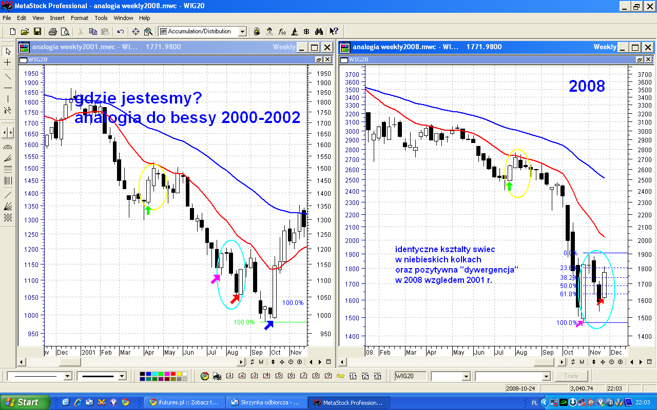 3. zatrzymanie długą białą świecą, po czym doji, dwie czarne i znowu biała UP (w niebieskich kółkach). W tym przypadku różnicą jest brak nowego dołka w 2008 po zejściu drugiej czarnej. Wynika to chyba z mocniejszego odreagowania obecnie, gdyż od szczytow w zółtym kółku 2001 indeks spadł o 1/3, natomiast w 2008 aż o połowę.