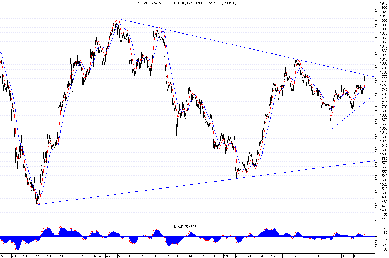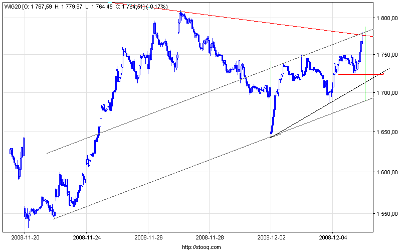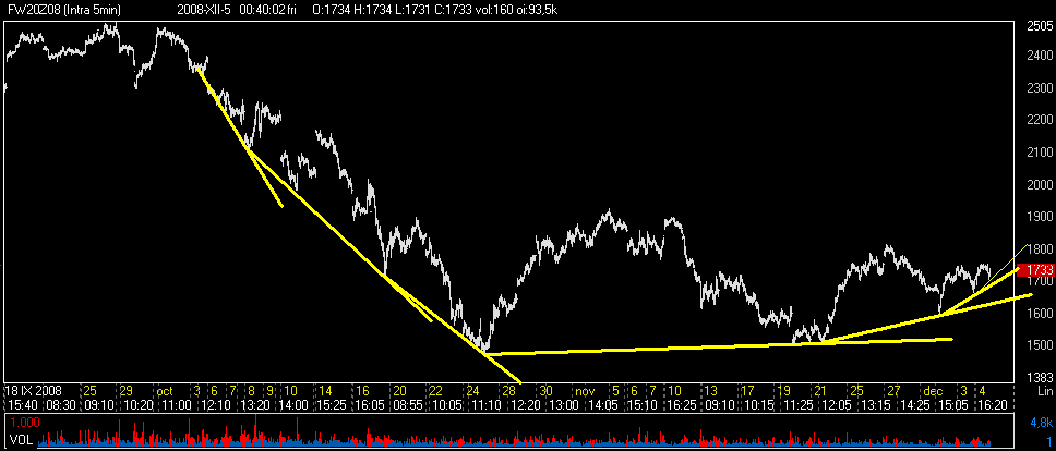 N a wielu wykresach pojawił się trójkąt o czym pisałem w ''swieczkach'', ponieważ jest formacja kontynuacji spodziewam się jednak wybicia dołem. Dzisiaj każde podejście w okolice poziomu 1730-20 pkt traktowałbym jako dobrą okazję do zajęcia pozycji krótkiej.
