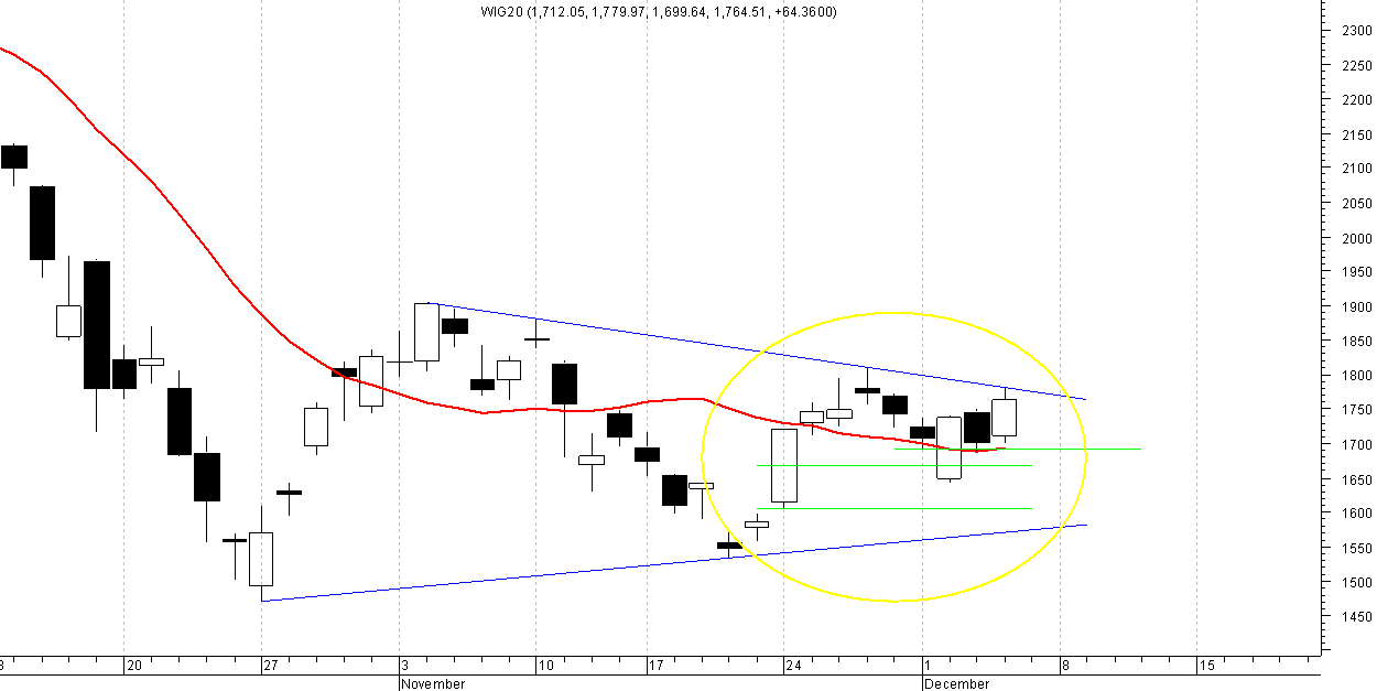 Na czwartkowej sesji w20 zachował się zgodnie z prognozami, docierając aż do górnego ograniczenia trójkąta.