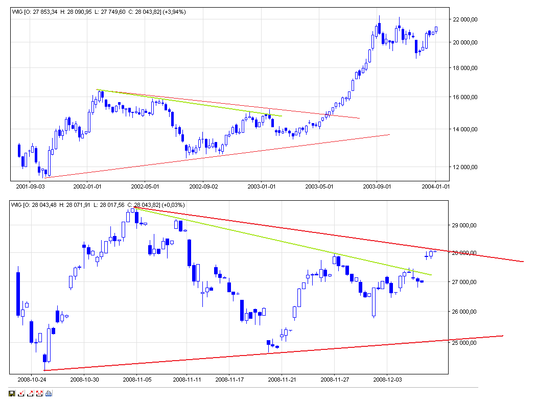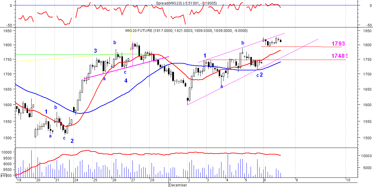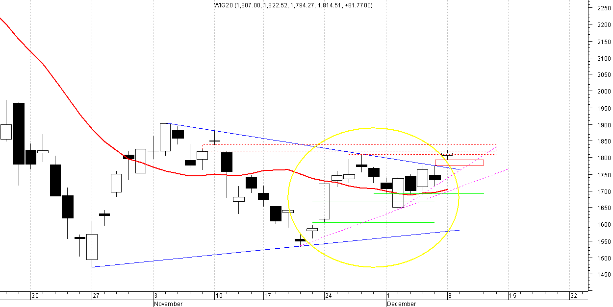 Zachowanie indeksow jest mocno skorelowane z sytuacja na rynkach swiatowych. Dalsze zachowanie indeksow w tej chwili nie jest jednoznacznie przewidywalne. Do rozpoczecia realizacji formacji opisywanych przed 2 tygodniami jeszcze troche punktow pozostalo.