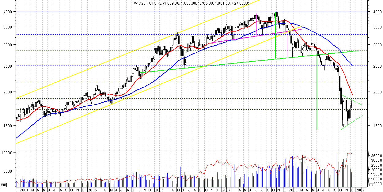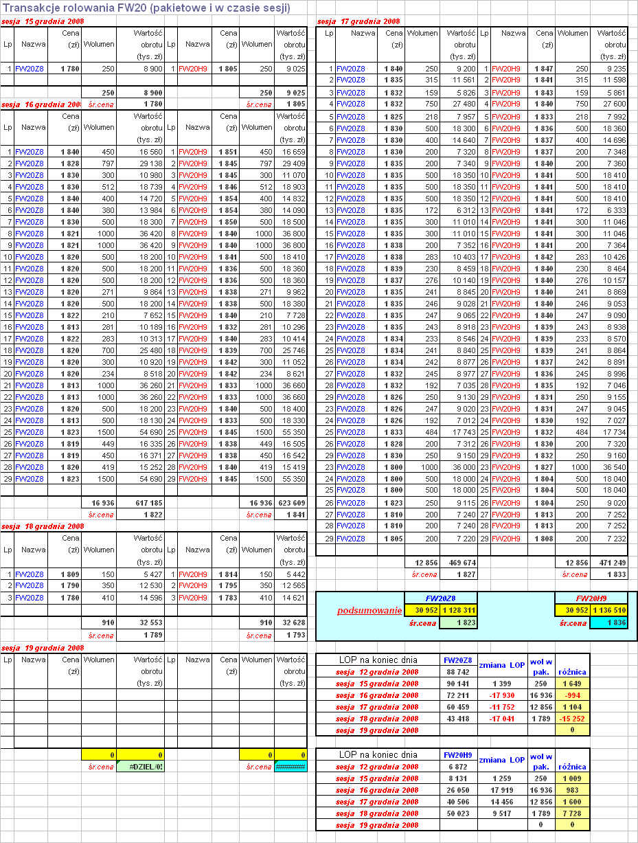 Wygląda na to, że piątkowa sesja może być zapamiętana z racji "bicia piany" przed sesją. Przyczynia się do tego sama GPW wprowadzając ograniczenia w obrocie i wahaniach kursów oraz być może również sam "korsarz", który w znaczący sposób ograniczył ilość posiadanych pozycji na serii Z. Wg moich kalkulacji w tym tygodniu rolowano ok 31k futów (tabela: transakcje rolowania - XII 2008). Również bez rolowania zamykano w pakietach kilka razy po kilkaset sztuk. Powyższa sytuacja pokazuje, że "korsarz" przesiadł się na następną serię i postanowił przeczekać nagonkę prowadzoną na niego przez "resztę świata" i poczekać na "lepsze czasy".