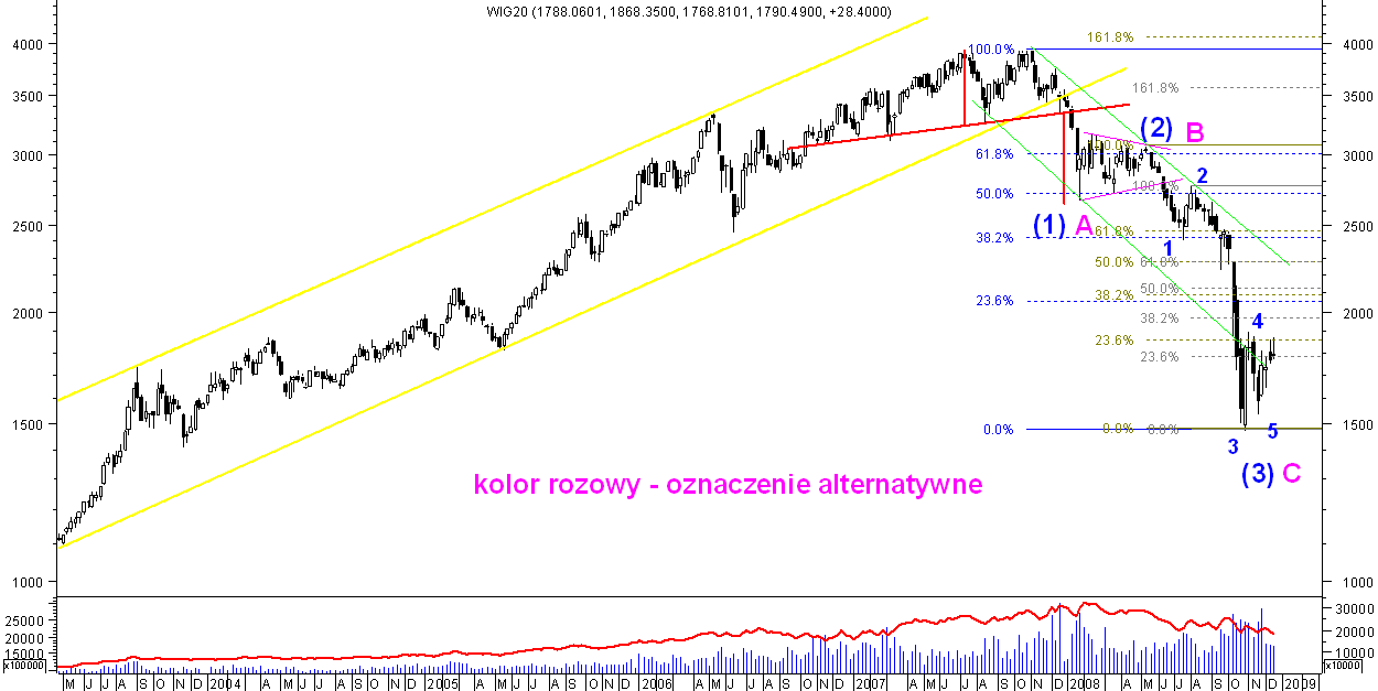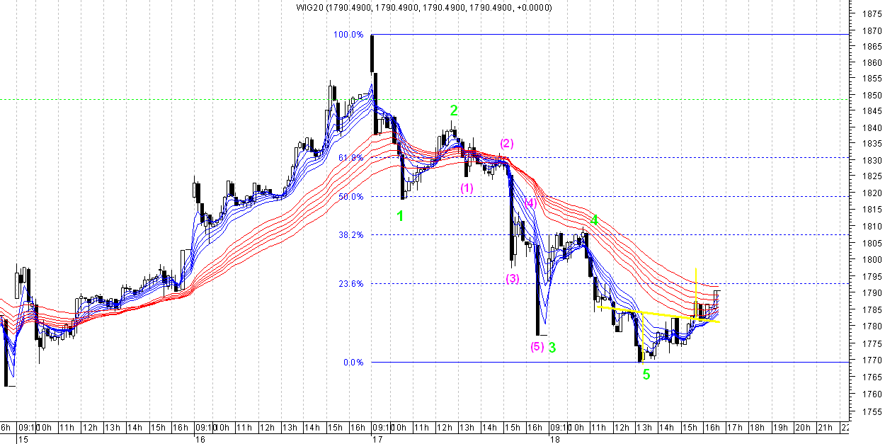 Sytuacja techniczna indeksu zrobiła się prospadkowa. W20 rysując objęcie bessy wyszedł dołem z klina (trójkąta) rysowanego przez radka 2 dni temu, a na czwartkowej sesji wykonał tylko ruch powrotny do jego dolnego ograniczenia (w20-daily). Co prawda na wykresie intra widać wyraznie "szkoleniową" piątkę w dół zapowiadającą przynajmniej jakieś korekcyjne odbicie abc (w20-10'). Jednak wykresy weekly dalej dopuszczają możliwość spadków, w celu realizacji podfali 5 (w20-weekly), chyba, ze 5 byłą falą załamaną, co jest też możliwe, ale na tę chwilę nie można zdecydować, który wariant jest prawidłowy. Możliwość testowania dolnego ograniczenia trójkąta widać równiez na wykresie kontynuacyjnym fw20 (fw20-weekly).