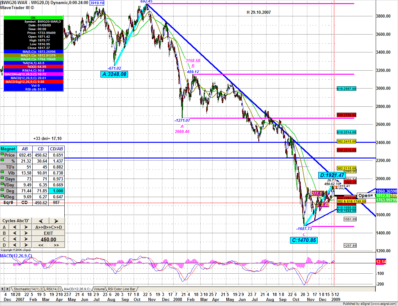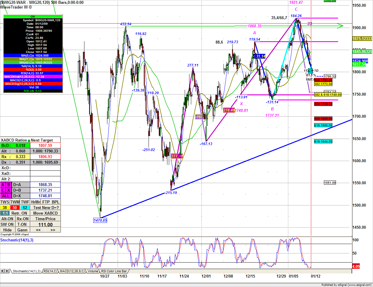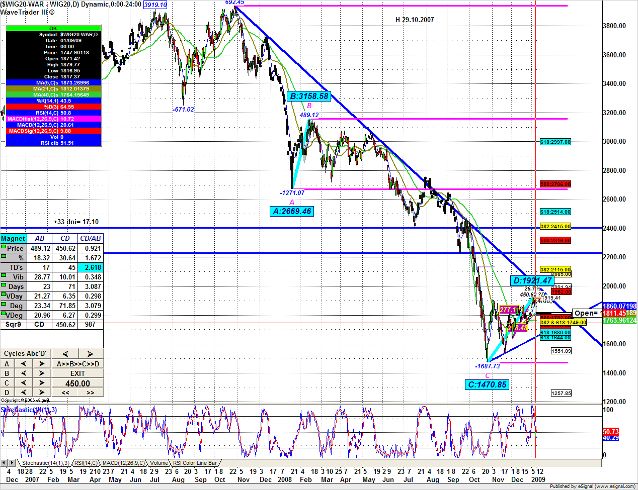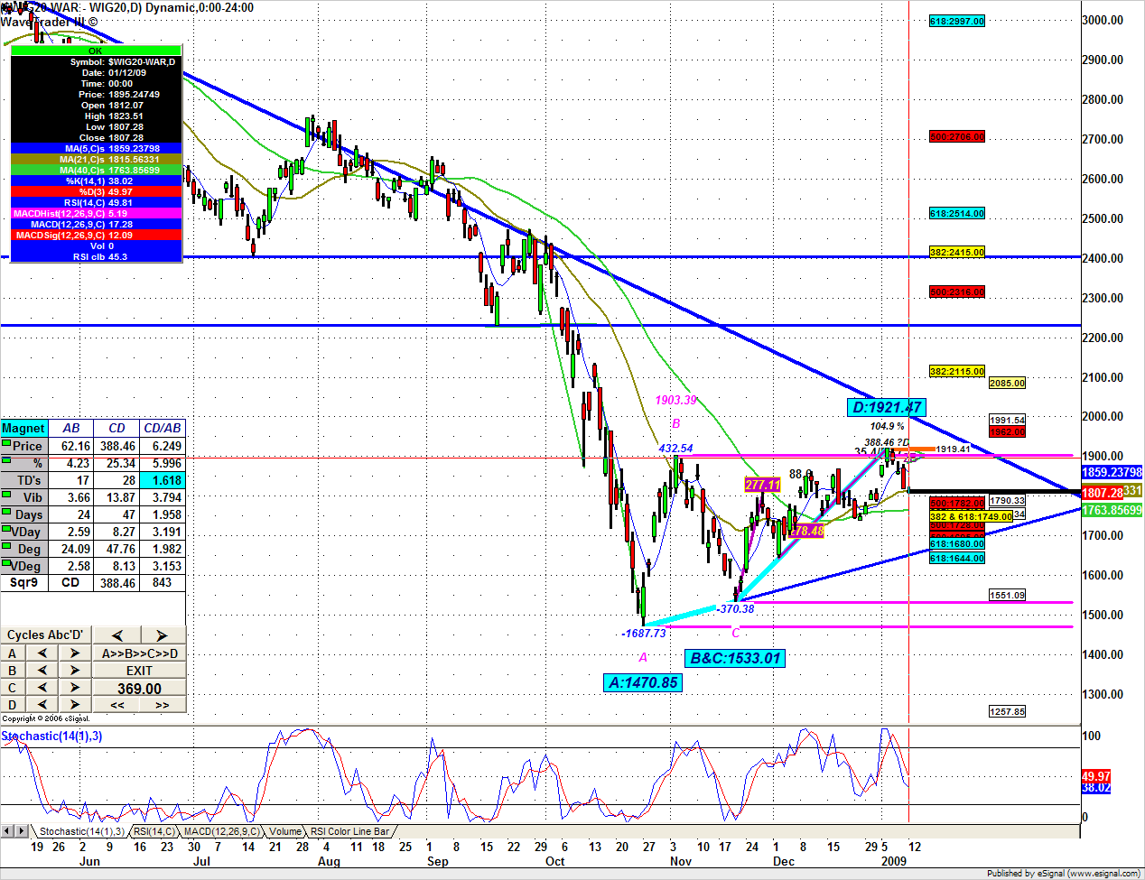 Na poczatku stycznia zobaczylismy w koncu wybicie z zakresu miesiecznych wahań o ktorych pisalem <a href=http://www.ifutures.pl/viewtopic.php?t=1460>15 grudnia</a>. Niestety po wybiciu w gore ktorego dynamiki raczej nikt sie nie spodziewal, nastapil ruch korekcyjny przed ktorym ostrzegal podczas sesji 7 stycznia ostrzegal nas <b>Lucek</b>. Jezeli potraktujemy obecny spadek jak ruch powrotny do przebitej spadkowej (FW20 ok. 1810-20pt wykres EOD) to byki maja jeszcze szanse na zarobek, nalezy jednak pamietac, ze zanegowanie wybicia z formacji czesto staje silnym odwrotnym sygnalem.