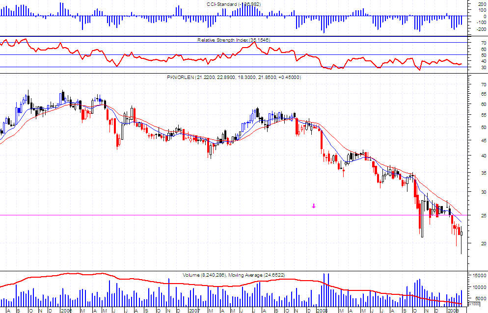 TPSA znajduje się w prostokącie 19-24 w tym tygodniu wybicie w dól z młotkiem można uznać za naruszenie i oczekiwać powrotu ponad 19 zł, PKOBP wybicie w dół na obrocie, póki nie wrócimy ponad 22,8 można oczekiwać kontynuacji spadku, PKN młotek , w dodatku 4 z ostatnich 5 świec week mają dolne cienie, tutaj dopiero wyjście ponad 25 złoty zapowiada poprawę koniunktury, PEKAO świeca wybijająca w dół na obrocie z dolnym cieniem, porawę nastrojów przyniesie wzrost powyżej 100 złotych