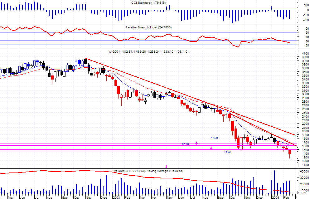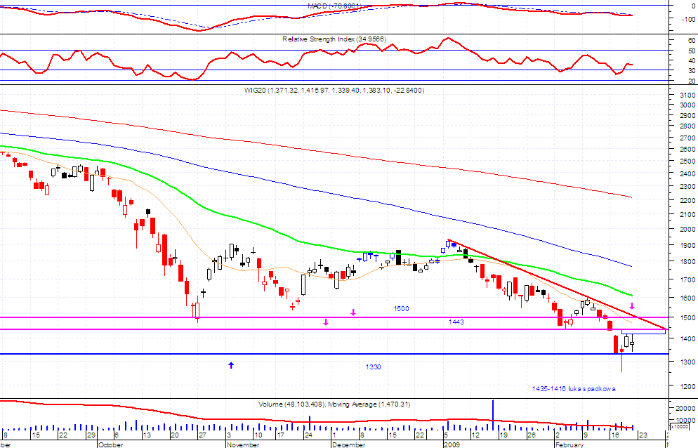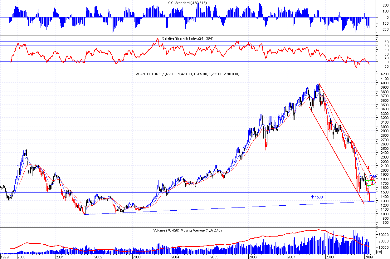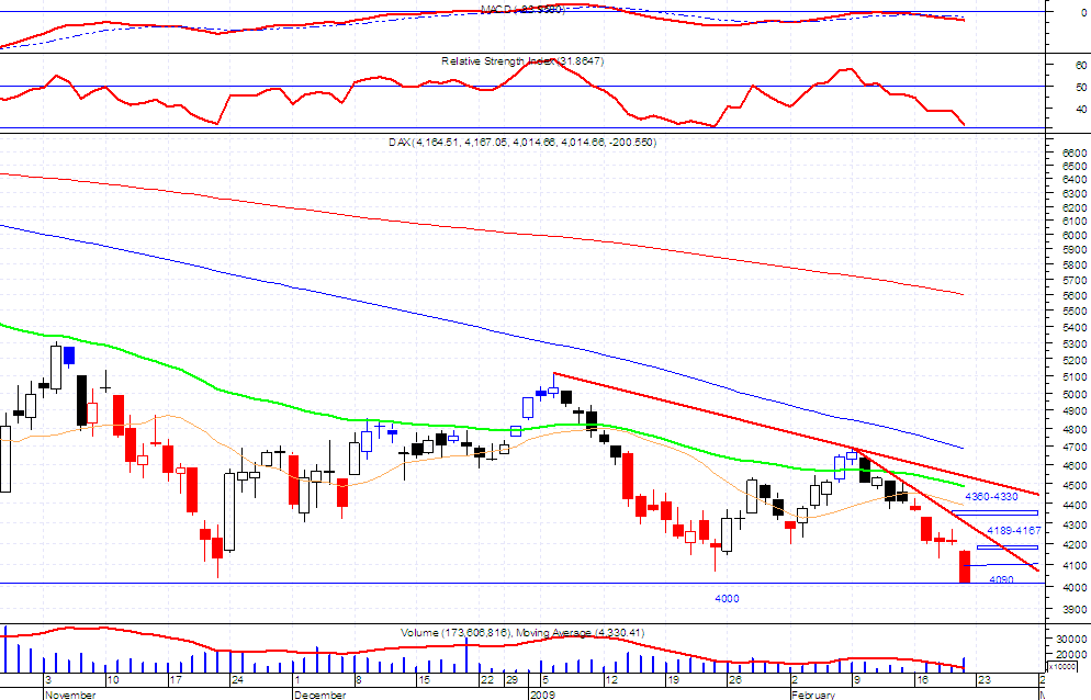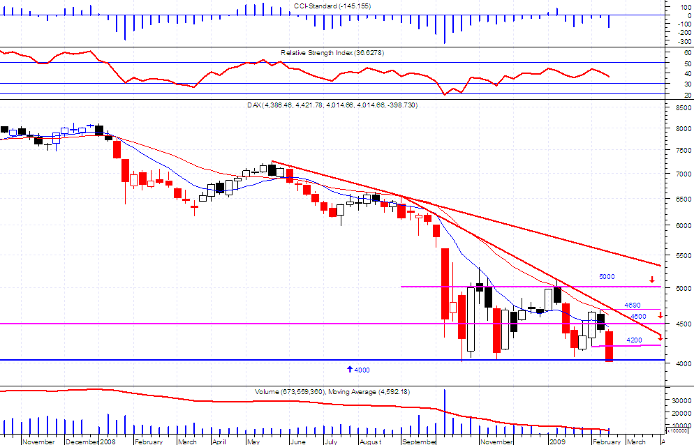 Week: o tym wykresie nie można powiedzieć nic dobrego poza tym , że nie przełamano jeszcze 4000 pkt. Kurs porusza się w obszarze 4000-5000 pkt od września 2008 roku. Przełamanie 4000 to nieuchronny spadek o przynajmniej 1000 pkt. Najbliższy opór to 4200 pkt, wyżej ma 13, ma 26 i linia trendu spadkowe. Tutaj mała dygresja- warto zapisywać poziomy tygodniowe wsparć i oporów. Im dłużej piszę ''świeczki'' tym coraz wyraźniej widzę jak te poziomy grane są na wykresach day i intra. Warto więc wracać do wykresów tygodniowych.