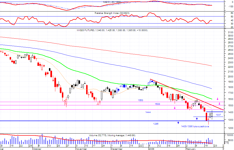 Day: formacja gwiazdy porannej, pokonane połówki czarnej świecy, teraz oporem są luki spadkowe, po ich ewentualnym pokonaniu marsz w kierunku n1500 pkt a po drodze pór na 1440. W przeciwnym razie tzn. przełamanie poziomu 1285 to test ostatnich dołków