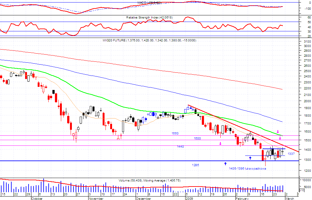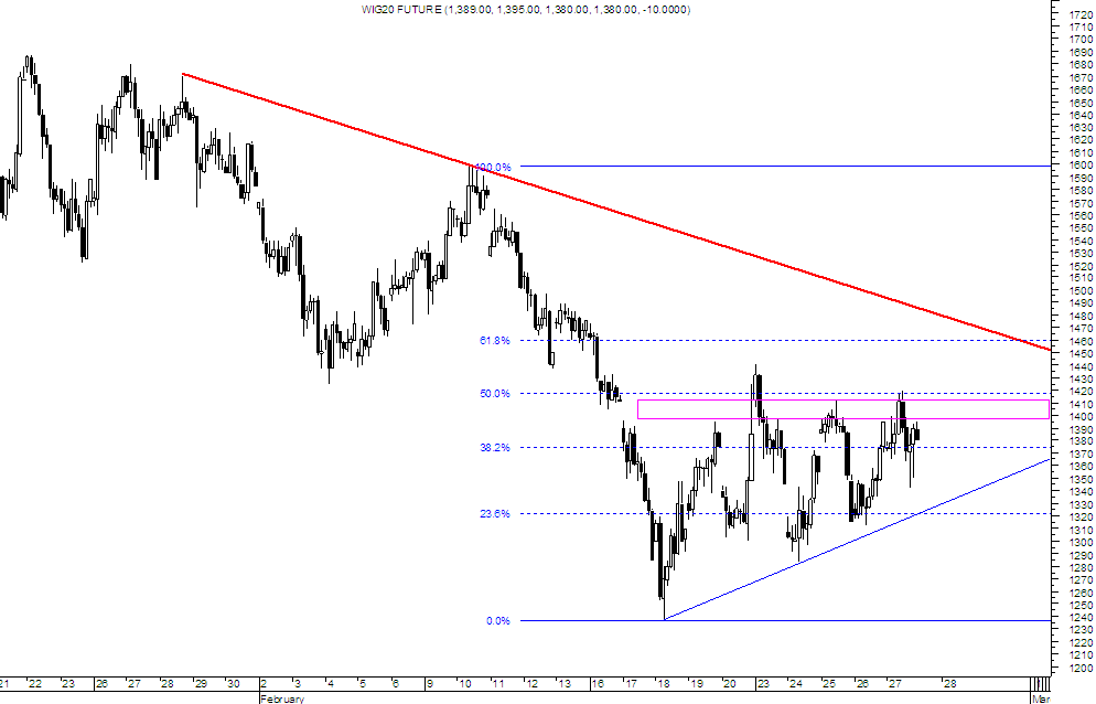 Day: Opisane przed tygodniem opory 1440 i niżej luka spadkowa 14-5-1396 okazały się zaporami nie do przejścia dla kupujących. Obecnie konsolidacja w przedziale 1400-1300 pkt z małym wskazaniem na byki. Na początku tygodnia kolejny atak na lukę bessy ( na fw 1396-1405). Jeśli nie zamkniemy tej luki na początku tygodnia to czeka nas kolejna głęboka przecena. Po drodze wsparcia na 1337,1285 i ostatni dołek 1235.