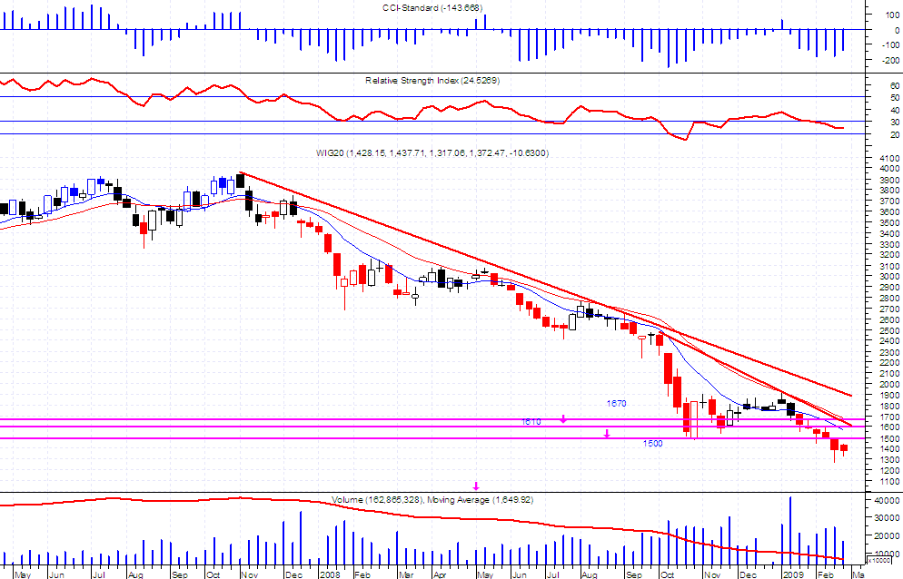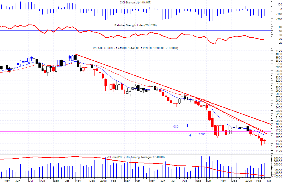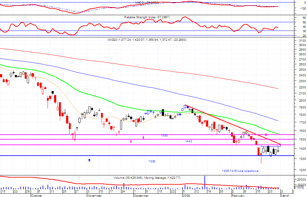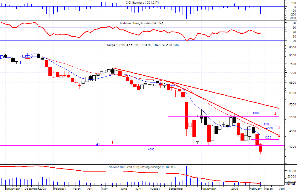 Week: ''..o tym wykresie nie można powiedzieć nic dobrego poza tym , że nie przełamano jeszcze 4000 pkt. Kurs porusza się w obszarze 4000-5000 pkt od września 2008 roku. Przełamanie 4000 to nieuchronny spadek o przynajmniej 1000 pkt. Najbliższy opór to 4200 pkt, wyżej ma 13, ma 26 i linia trendu spadkowe. Tutaj mała dygresja- warto zapisywać poziomy tygodniowe wsparć i oporów. Im dłużej piszę ''świeczki'' tym coraz wyraźniej widzę jak te poziomy grane są na wykresach day i intra. Warto więc wracać do wykresów tygodniowych....'' w grze teraz 4000 tysiące to mega opór.
