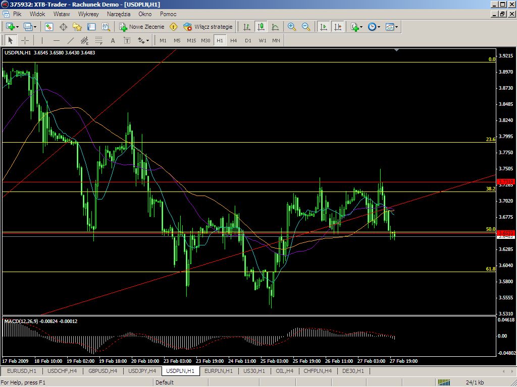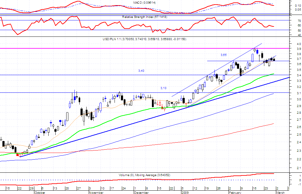 ''...Warto obserwować wykres usd/pln tutaj obrona poziomu 3,65, możliwy test maxów. W przypadku przełamania 3,40 spadek w kierunku 3,40 i 3,10...'' Imo dwie czarne świeczki day zapowiadają osłabienie w kierunku 3,40, po drodze wsparcie na 3,62. Alternatywą jest wyjście ponad 3,75 i test szczytu. Na bardziej szczegółowym wykresie widoczny jest prostokąt 3,73-3,65, wybicie zaowocuje ruchem równym co najmniej wysokości prostokąta.