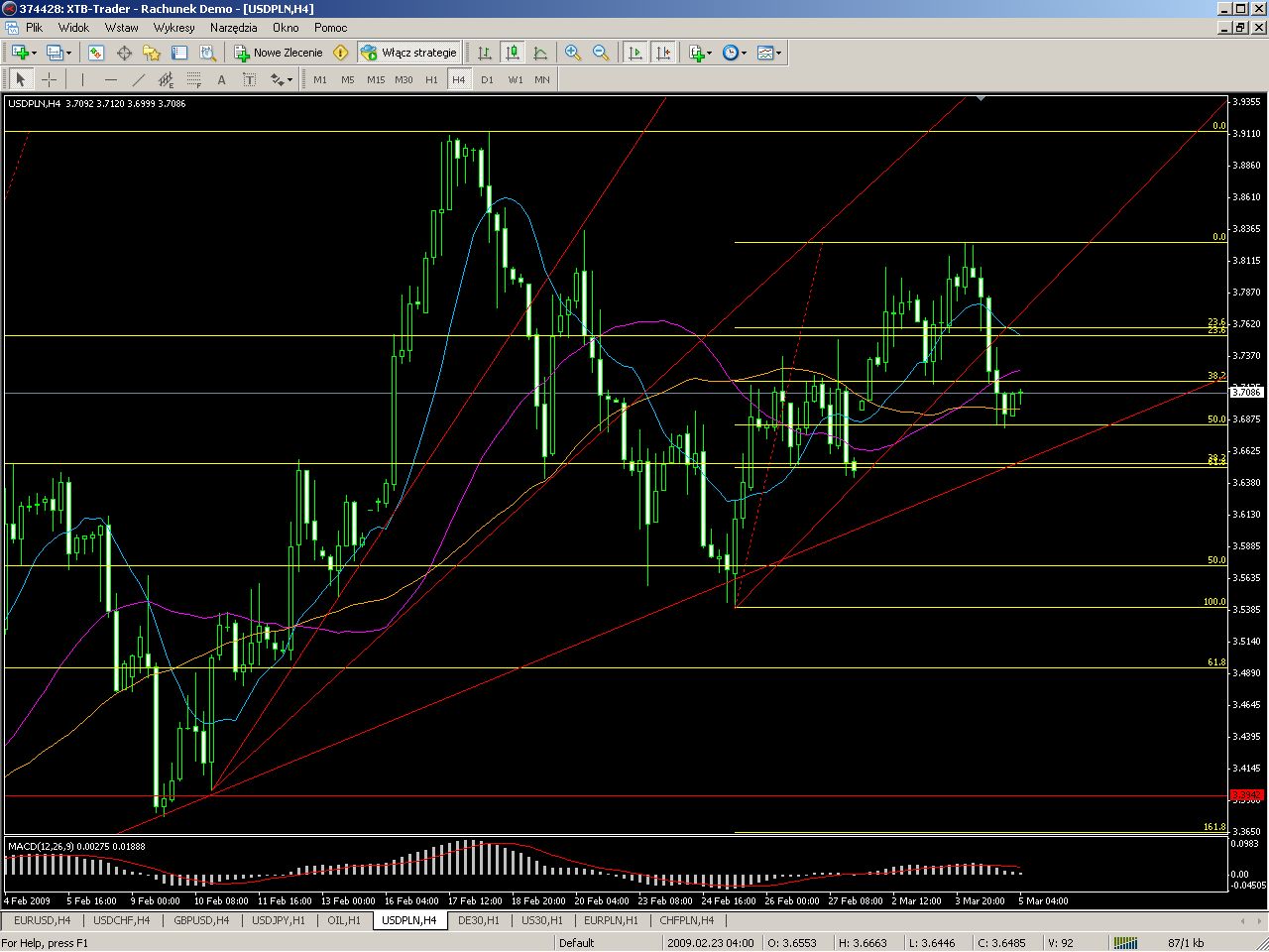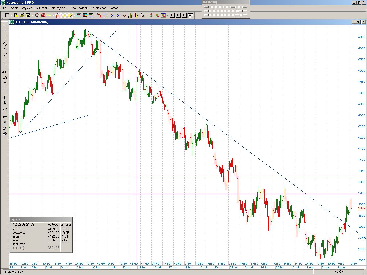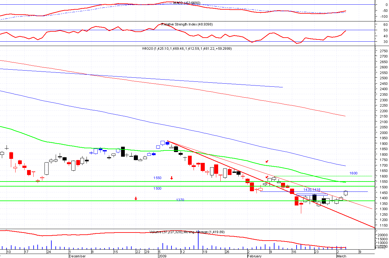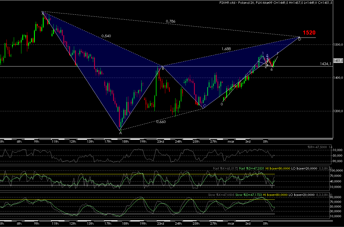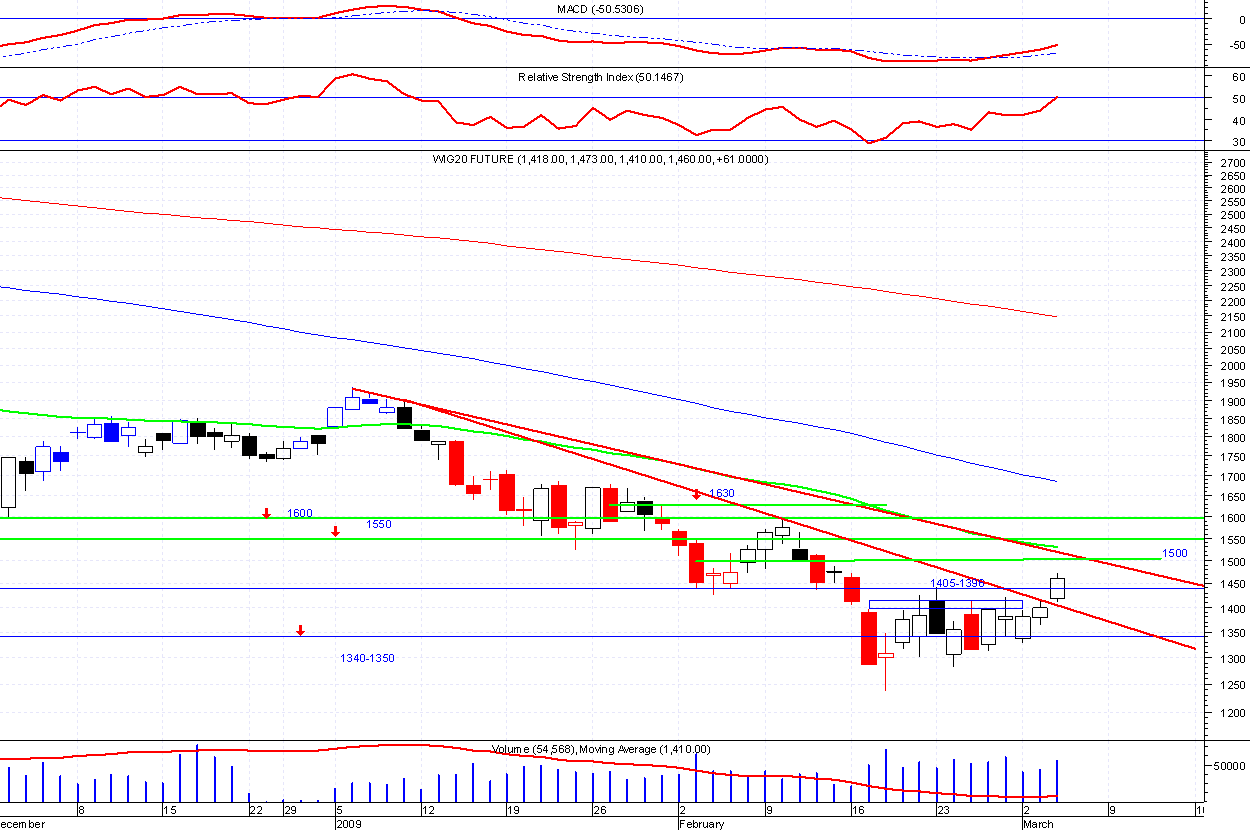 Mozolna orka bykow dala wreszcie efekty. Pokonaliśmy ostatnie luki i przebiliśmy spadkowe linie trendu na wykresach dziennych. Pojawił się sygnał kupna. Linie trendu spadkowego ,którą pokonaliśmy ma początek w styczniu. Na wykresach week pojawiły się objęcia hossy , ciekawe jak skończymy tydzień. Konsolidacja trwała trochę czasu wie wzrost powinien dojśc minimum do poziomów 1580 -1600. Na wykresach tygodniowych do górnego ograniczenia kanału spadkowego. Jedynym zmartwieniem jest spadający lop , ale cóz mamy wygasanie serii. Teraz pomaga nam tez Usa i Dax , który wczoraj pokonał linie trendu spadkowego od 9 lutego. Pomaga nam też wzmocnienie złotówki , która powinna niedługo kosztowac wkróce ok 3,4 $