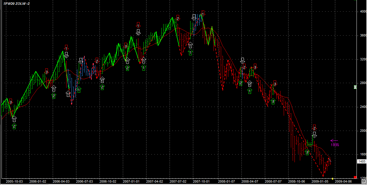 Jeżeli chodzi o Extras to chciałbym zacząć publikować sygnały systemu, którego nazwałem Żółw. Jest to system bardzo wolny, oparty na barach tygodniowych. Zawiera średnio siedem transakcji w roku. System jest niesymetryczny, tzn zajmuje 2 pozycje zgodne z trendem, jedną przeciw trendowi. Sygnał podawany jest na koniec świecy tygodniowej, czyli o ile nie ma luki można próbować zajmować pozycje w poniedziałek na open.