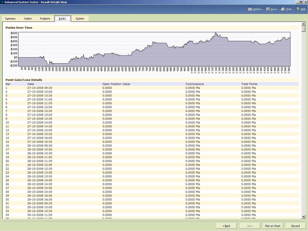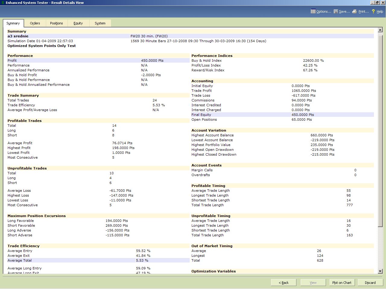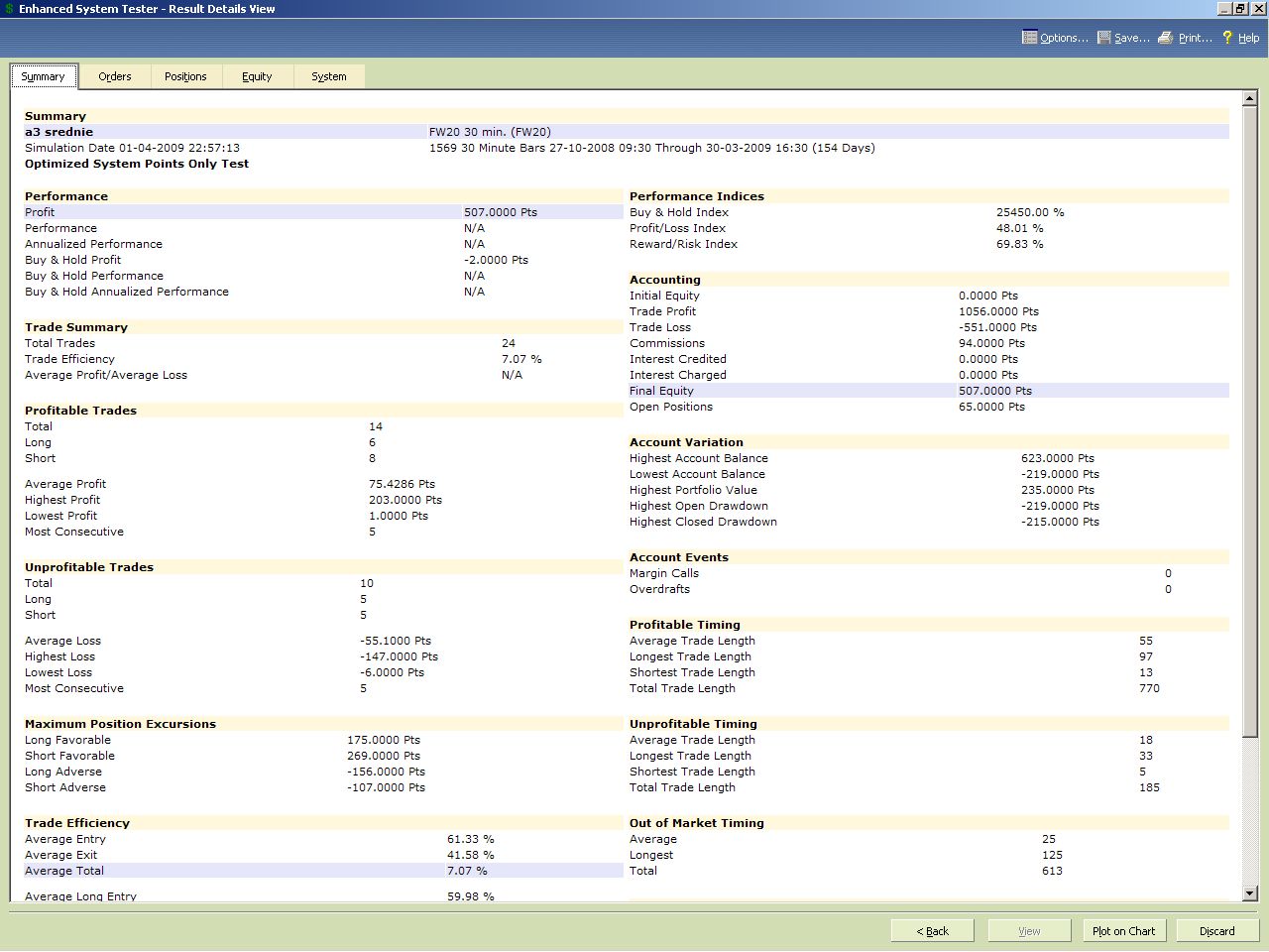 Poniżej zamieszczam wyniki systemu testowane w metastocku od 27.10.2008 do 31.03.2009, czyli okres publikowania na forum. Wyniki sa lepsze od gry w realu o ok 100 pkt i zawieraja juz prowizje 2 pkt od wejścia na kontrakcie. Zestawiam 2 systemy 1 z najlepszym wynikiem- 507 pkt i drugi- 450 pkt -aktualnie publikowany na forum.