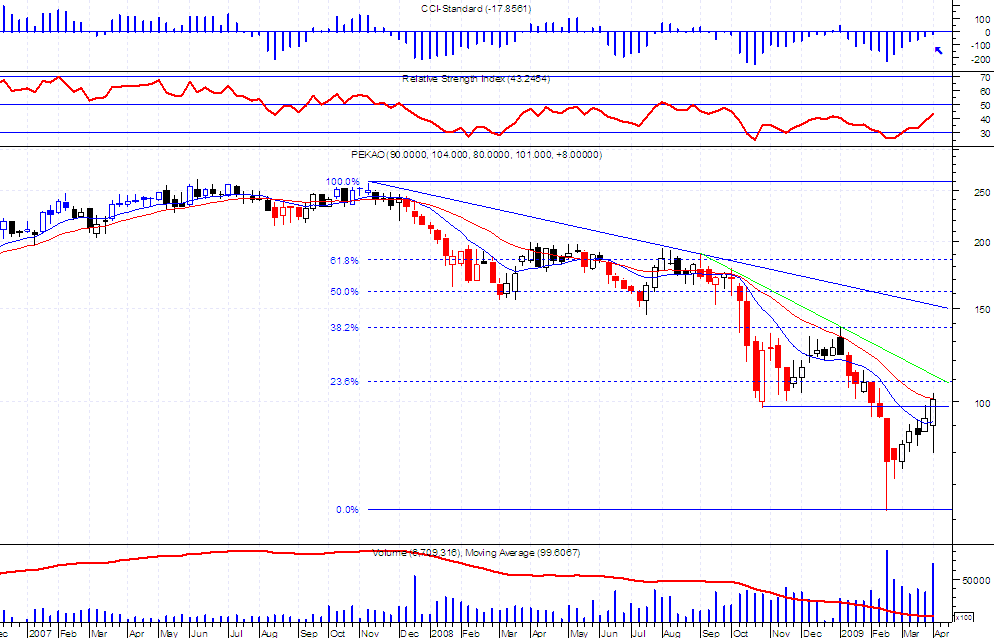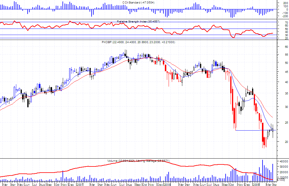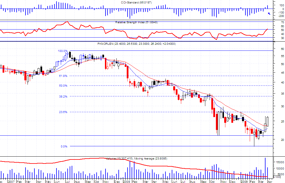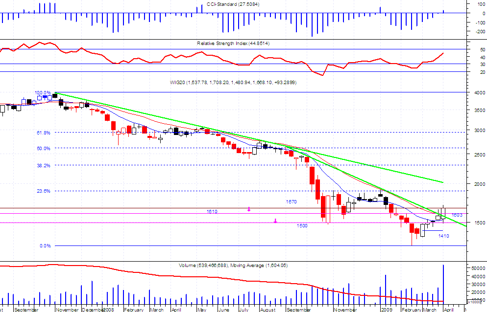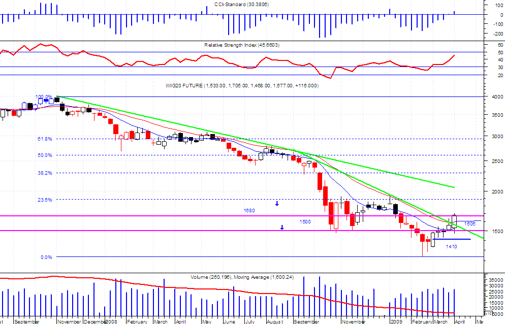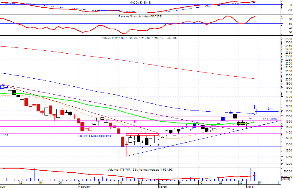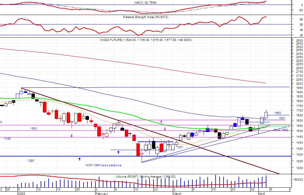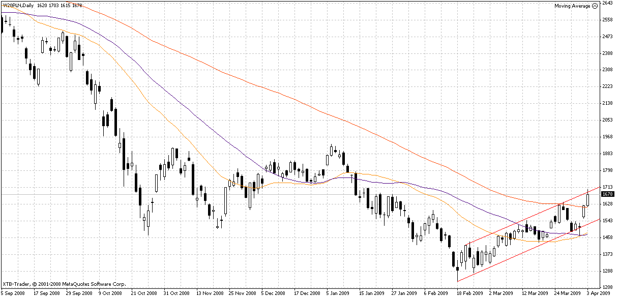 Day: Pokonaliśmy ma 100, która teraz stanowi poważne wsparcie. Trend ma się dobrze i nabiera rozpędu, póki nie zamkniemy luki hossy można oczekiwać kolejnych 2 luk. Najbliższe poziomy obrony to 1650 i 1600 pkt. Ostatnie białe świece zostały potwierdzone obrotem.