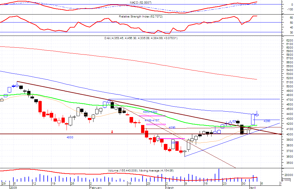 Day: Wygląda bardzo ładnie , możliwy wzrost nawet do poziomu 4700. Obecnie wyraźnie ponad ma15 i ma45, pierwszy test ma100 , która stanowi teraz ważny opór. Trend na razie niezagrożony, wsparcia to 4280, 4200 i 4000.