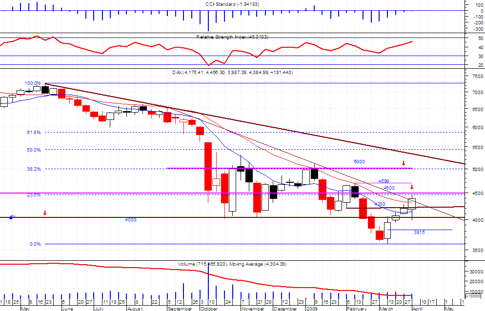 Week: kolejny udany tydzień i pierwsza próba pokonania oporu na poziomie 4500. Kurs walczy z liniami trendu spadkowego. Wyraźne wyjście ponad ma 13 i ma26, jeszcze 2 dobre tygodnie i może powstać sygnał kupna. Cały czas w mocy biała świeca sprzed 4 tygodni.