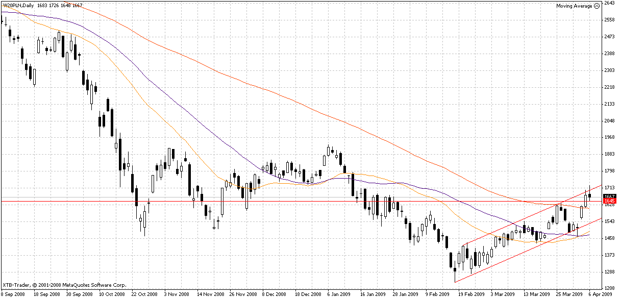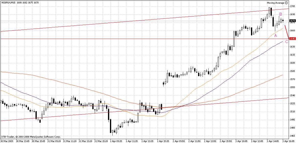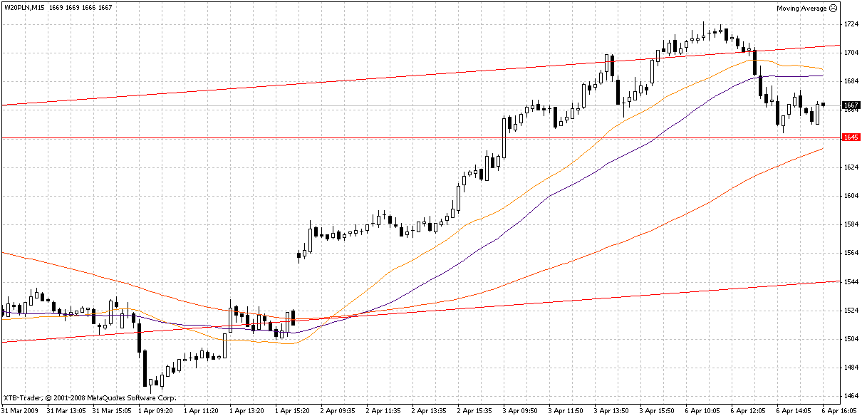 Wig 20 porusza sie obecnie w kanale, ktory to sugeruje korekte na poczatku tygodnia, zreszta koncowka piatkowej sesji to korekta intraday w calej rozciaglosci. Nie powinniśmy spasc ponizej 1645 , aby wielki tydzien zakonczyc powyzej 1700