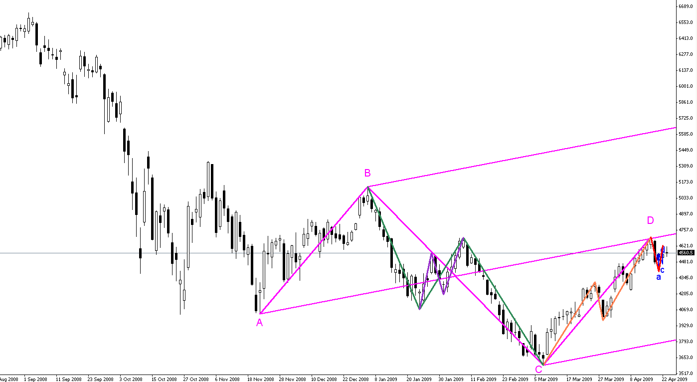 Końcówka sesji w USA sporo namieszała.W każdym razie pogorszyła sie sytuacja na wykresach.Na fDAX mamy jakby strukture 3 falowa wzrostowa a to oznacza dosc duże prawdopodobienstwo spadkow.Jest oczywiscie spora szansa na obrone linii ramion czyli 4460pkt.Przełamamie tego poziomu zanegowałoby ORGR-a ale juz poziom ponizej 4500 daje duze watpliwosci co do realizacji tej formacji.Nadzieji dodaje fakt ze ostatnie wzrosty zniosly blisko 75% fali spadkowej a zwykle fala korekcyjna znosi 38-62%.Ponadto fala spadkowa byla 3 falowa wiec szanse na wzrosty sa spore bo rzadko zdarza sie korekta typu flat.