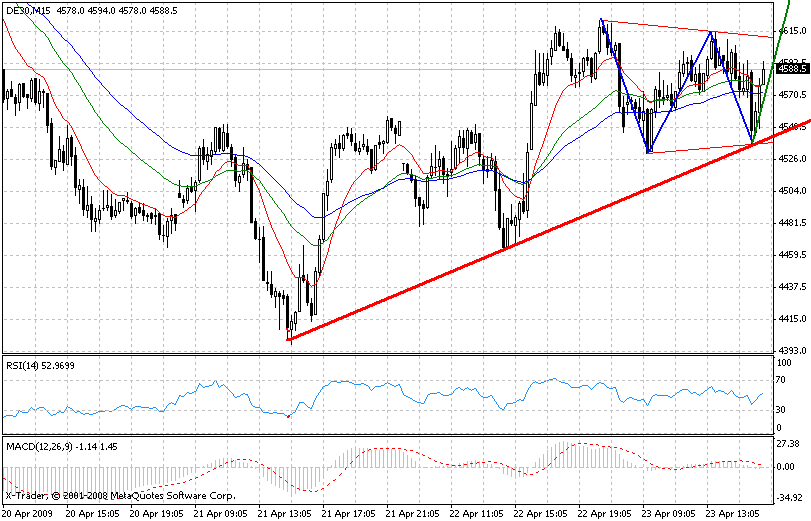 dax 15 min - linia trendu (czerwona gruba kreska dodana do wykresu giełdziarza),
