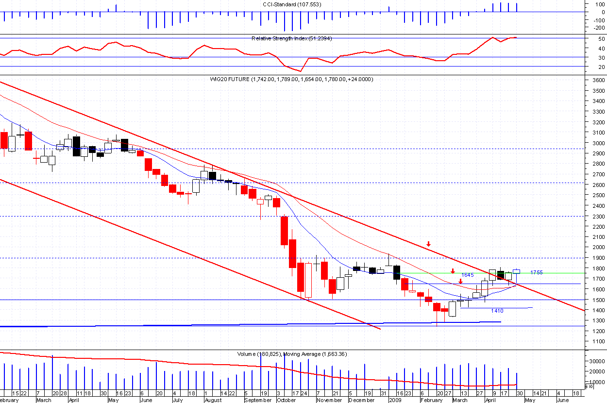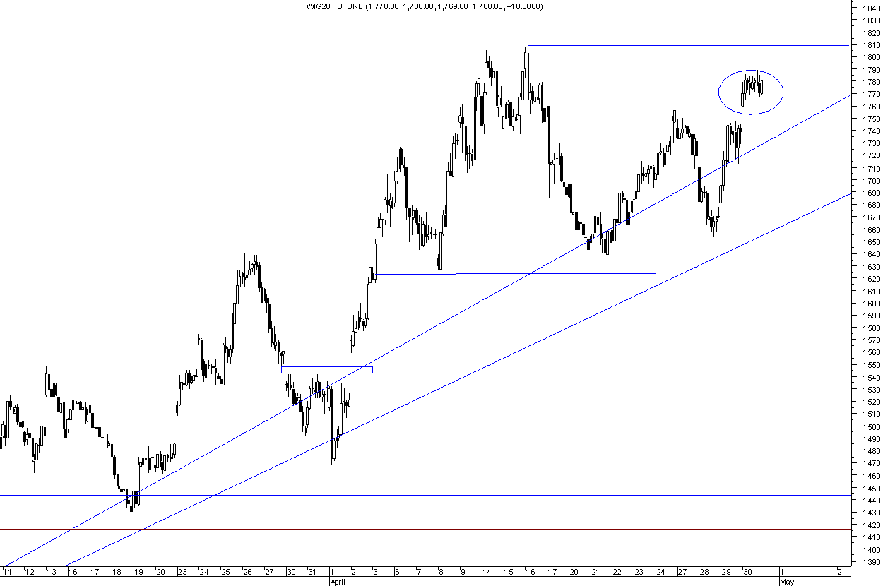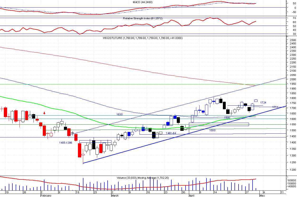 Day: ''...Trend ma się dobrze i nabiera rozpędu, póki nie zamkniemy luki hossy można oczekiwać kolejnych 2 luk...''' . Czy w czwarte była 2 luka day? Byki broni ostatnia luka hossy , poziom 1711 pkt i niżej linia trendu , dopiero pokonanie tych 3 wsparć otworzy droge do spadków . Na tą chwilę droga do szczytu z początku roku otwarta.