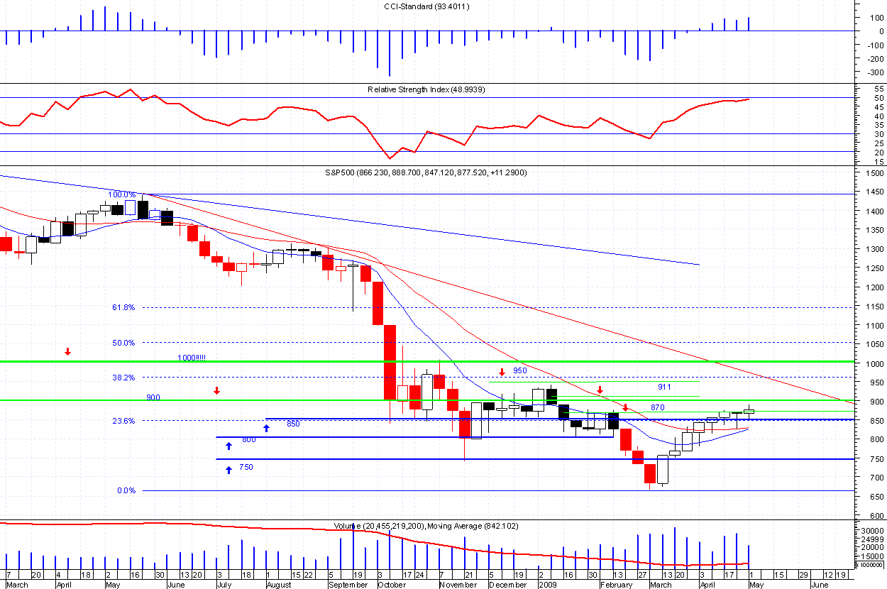 Week :Kolejnych biała świeca. Ma 13 i ma 26 bliskie sygnału kupna. Warto przyjrzeć się wykresowi pod kątem fibów. Poziom 910 i tam fib32% powinny zadecydować czy to korekta czy koniec spadków. Pokonanie poziomu 50% fib i 1000 pkt przekona mnie ostatecznie o końcu bessy. Wsparcie w okolicy 850 pkt. Wydaje się ,że bykom brakuje tchu, ostatnia bial świeca nieco anemiczna i potrzeba testu 850 pkt żeby nabrać sił. Bliskość bardzo ważnych oporów patrz wykres.
