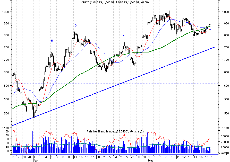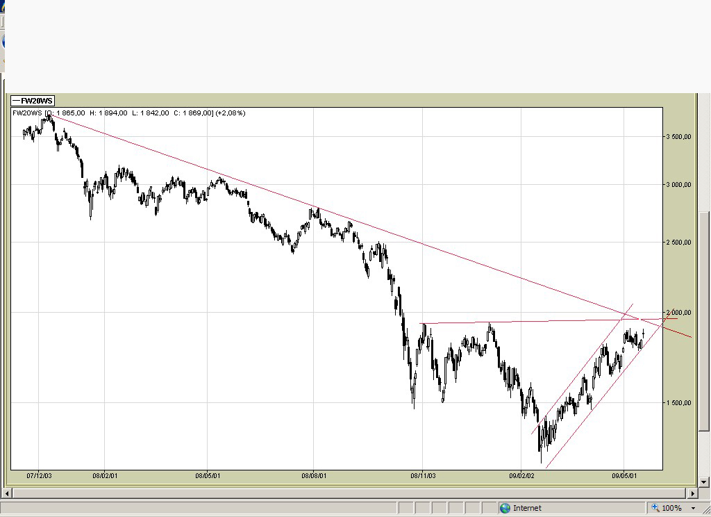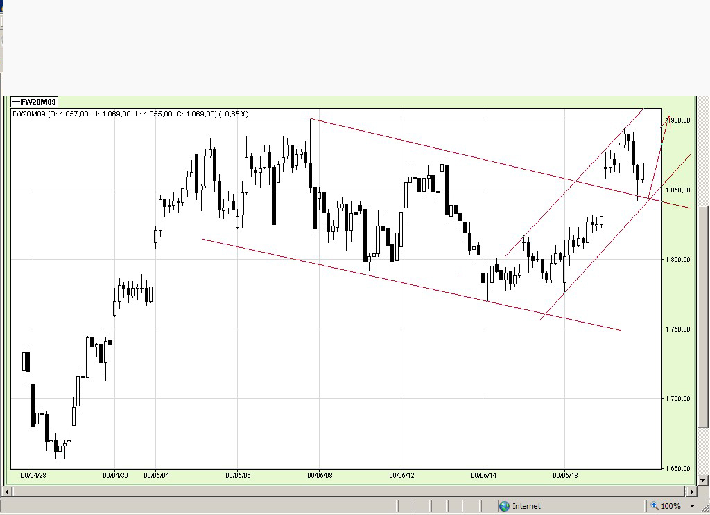 Rozpoczynamy trzeci tydzień wąskiej konsolidacji. Ceny odsunęły się nieznacznie od szczytu pozostając nadal nad trzecią luką (z 4 maja). Fakt, że już zasłoniętą ale linia wsparcia narysowana na załączonym wykresie WIG20 pozostaje w mocy. Konsolidacja przybrała kształt flagi, z której w najbliższym czasie może nastąpić wybicie w górę. Okoliczności sprzyjają, ale ta potyczka nie będzie miała znaczenia dla losów bitwy, a ta rozstrzygać się będzie powyżej 1900 punktów.