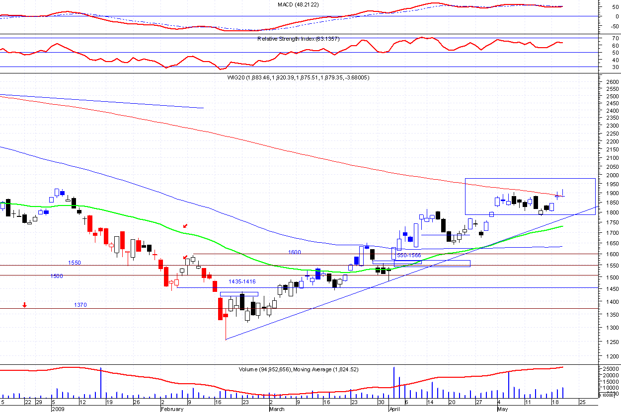 Dzisiejsza sesja dala szczyt niewiele ponad 1900. Na day po doji powstała spadająca gwiazda a nawet naciagany nagrobek doji ponad luka cenową- wszystko pod ma 200. Póki ta luka nie zostanie zamknięta byki sa bezpieczne. wg fal mamy wykonczona strukture 5 falową. Co nas czeka jutro??? Chyba wszystko możliwe ze wskazaniem na misie. Sprzedający pewno powalcza o potwierdzenie 2 ostatnich świec tygodniowych oraz kontynuacje znizki z poziomu 19xx. Mozliwe ,że o wszystkim zadecyduja waluty. Na razie za oceanem bez rozstrzygnięć.