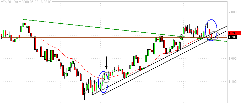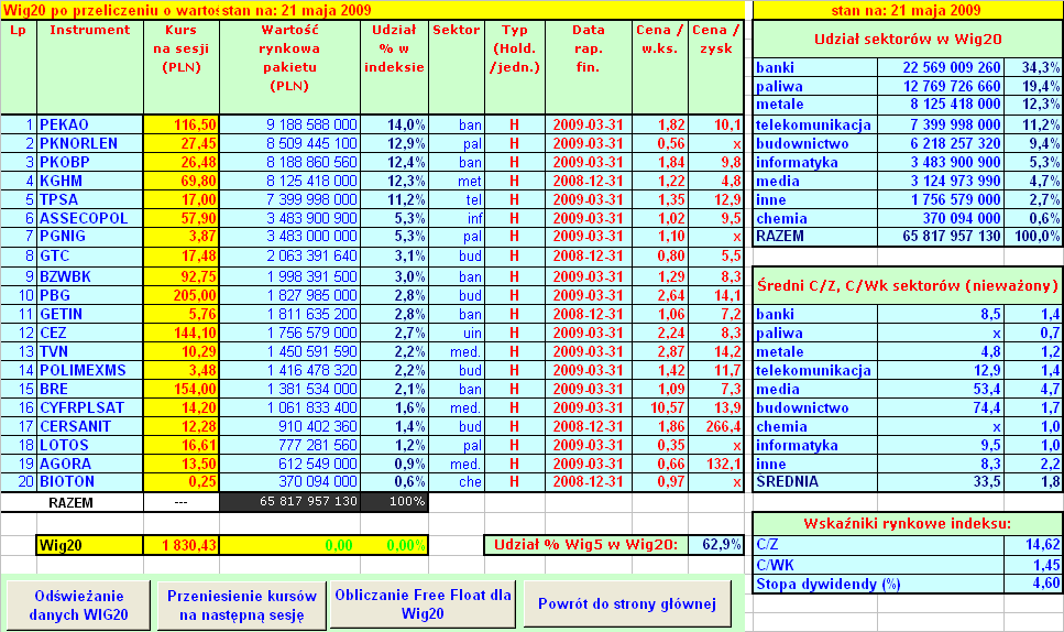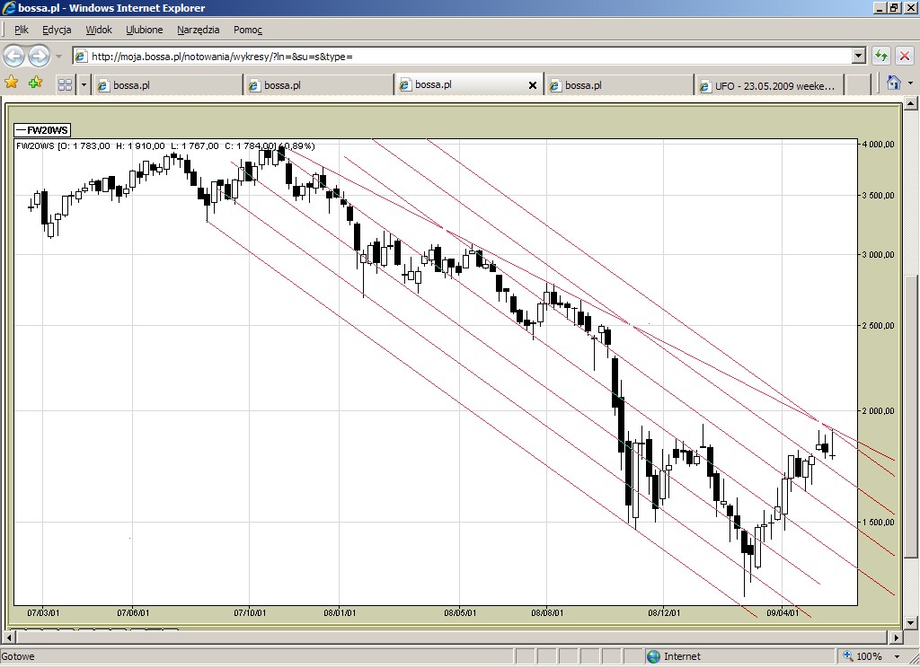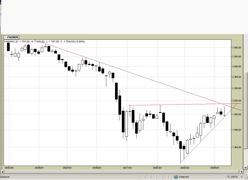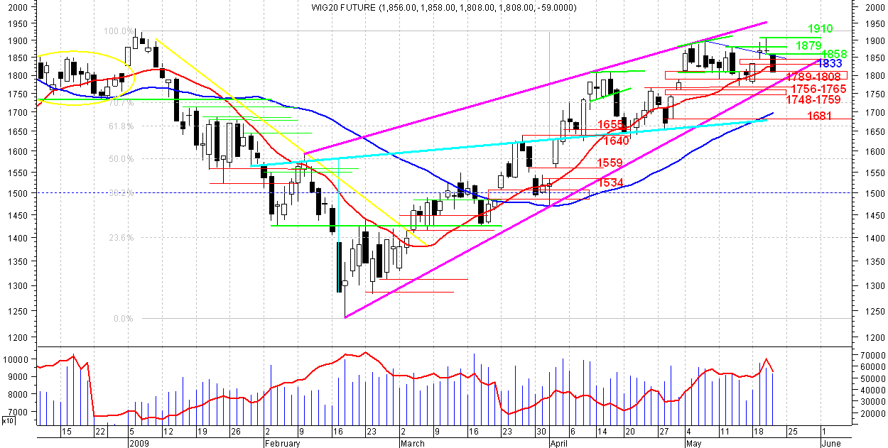 Kluczową dla czwartkowej sesji była ... ostatnia godzina środowych notowań w czasie której rynek był wyraźnie dołowany pomimo nowych maksów w USA jak również innych rynków wschodzących (bux, ise, rts - wymalowały długie białe świece i nowe szczyty). Jednocześnie Wig20 przy dużych obrotach minimalnie spadł co sugerowało dystrybucję akcji, natomiast LOP wzrósł niemal o 8.000 co świadczyło o "załadowaniu amunicji" przez tuzów rozgrywających tę sesję. Wydaje się, że gracze Ci zagrali (słusznie) pod ewentualny
