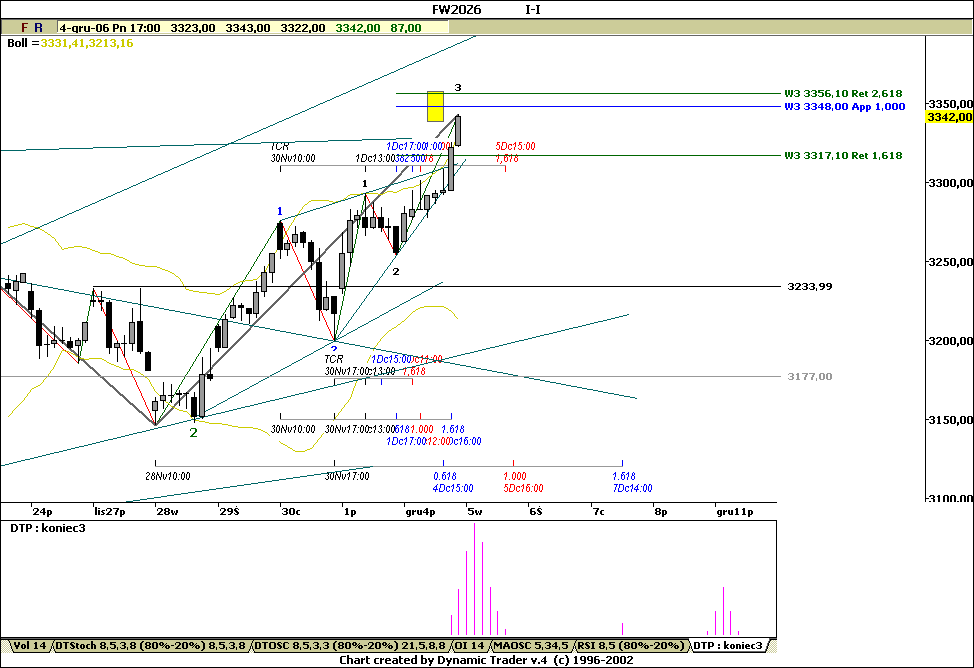 jesli jestesmy w 3 3 3 (drug? trzeci?, rozbilem na podfale z ktorej wychodzi takze trzecia) powinnismy zatrzymac sie na widocznych oporach +przewidywany koniec fali 3 (tej mniejszej) na jutro, wskazuja silne fibony czasowe dla tej fali.