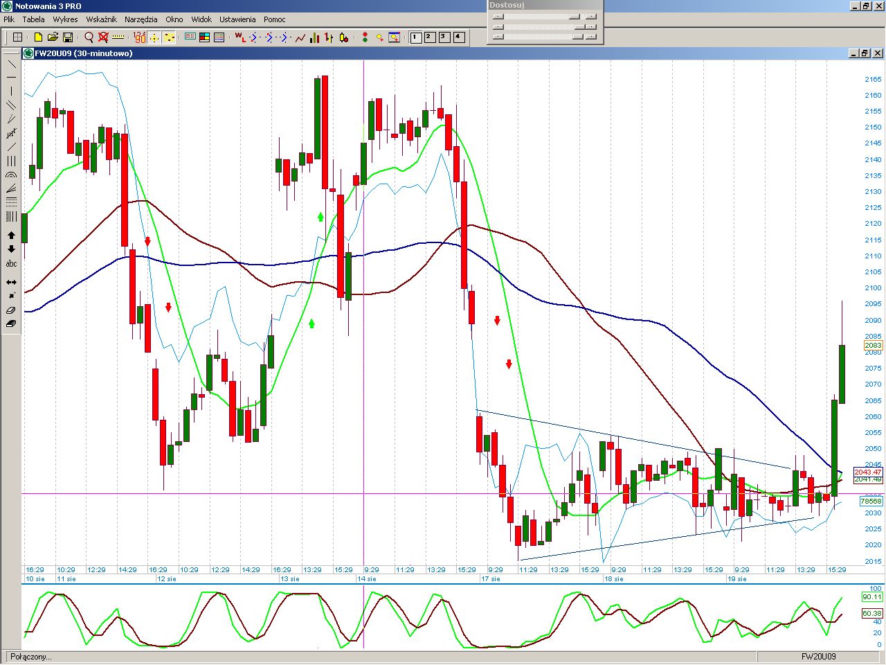 dzisiejsza końcówka sesji byla nieco zaskakująca, wybilismy sie góra z trójkąta. Czy to sygnal kupna/ Należy poczekać. Po pierwsze może to byc brakująca fala c w 4 lub fałszywka. przemawia za tym to ,że zwyzka odbyla się w końcowce sesji i mielismy juz kilka zaskakujących ruchow cen jak w fali 4. możliwe również ,że nadal przebywamy w konsolidacji 2150 2020 pkt. rynek nam pokaże co zrobic , elki juz mocno zagrożone. system jest el , ale ostatnio dawal mylne sygnaly jak zawsze w przypadku trendu bocznego. wart obserwować pare usd/pln.