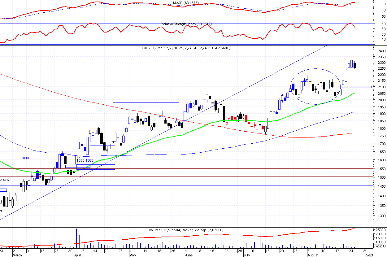 dziś byki dostały zadyszki lub inaczej zyskały zasłużony odpoczynek. Na wykresie intra mamy pewnie do czynienia z fala 4 i dzis zrobilismy z niej A I B i jutro powinnismy wykończyć fale C , ktora powinna sięgnąc około 2220 pkt. To wariant optymistyczny i bardzo prawdopodobny.Wykres week tez sugeruje odpoczynek od górnej bandy kanału wzrostowego.