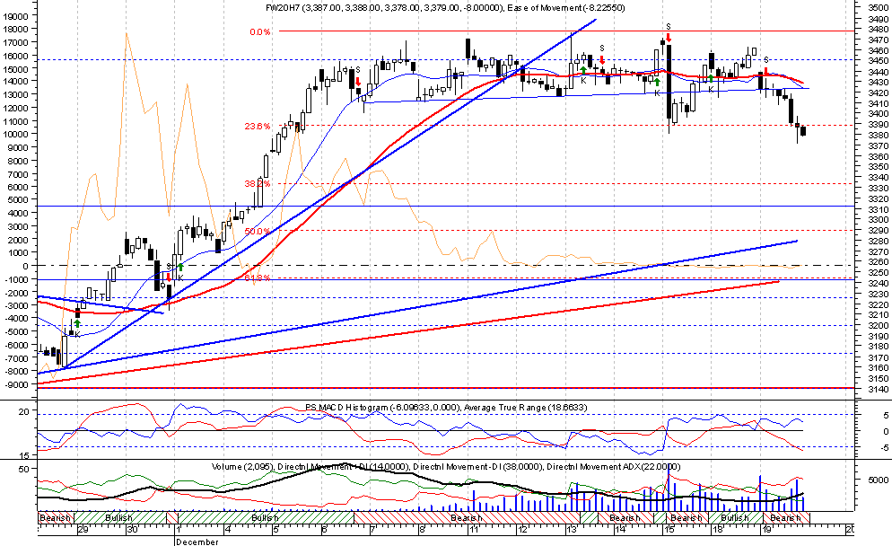 A jednak spadamy. Wczoraj bezczelnie i tanio wyci?gniŕty na maksa indeks dzisiaj nie utrzyma? siŕ tak wysoko. W wyniku fali spadkˇw na Dalekim Wschodzie otworzyliÂmy siŕ dzisiaj luk? bessy. Po pierwszych godzinach notowa˝ wydawa?o siŕ, ?e nie ma powodˇw do niepokoju. WIG20 na kilka godzin utkn?? w w?skiej konsolidacji. Kolejne dane makro po 14:00 i 14:30 sprowokowa?y dalsz? wyprzeda? i zaliczyliÂmy dzisiaj kolejny, g?ŕbszy ni? w piŕtek do?ek. Sytuacja na wykresie 60min wygl?da nieciekawie. ADX jest jeszcze niski i roÂnie podpowiadaj?c, ?e przed nami fala spadkˇw. Moim zdaniem ten kierunek nie jest jeszcze przes?dzony. Na rynku surowcˇw mied? znajduje siŕ tu? nad wsparciem, ale nie wykazuje objawˇw paniki i dzielnie siŕ broni. Zachodnioeuropejskie parkiety te? trzymaj? siŕ dobrze i sko˝czy?y dzisiejszy dzie˝ na niewielkich minusach. Je?eli w USA nie bŕdzie tragedii, to mo?emy szybko powrˇciŠ do wzrostu.. Wszak dotychczasowa korekta zabra?a byczkom tylko nieco ponad 23,6% dorobku.