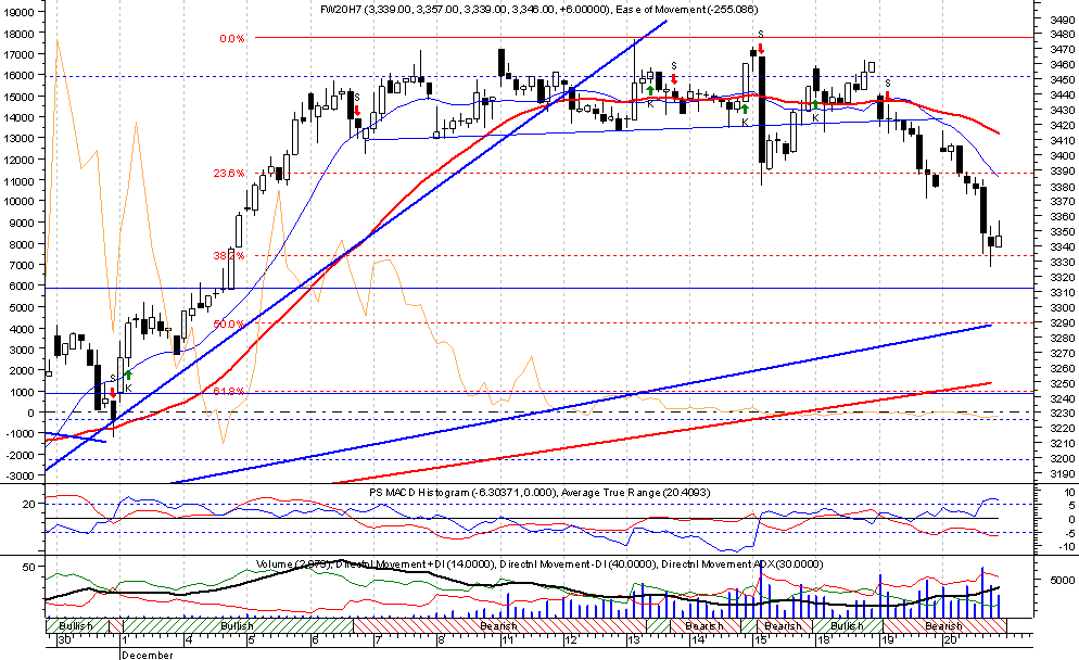 Potem by?o ju? tylko gorzej. Do po?udnia oparliÂmy siŕ o wczorajszy do?ek, po 14 zjechaliÂmy na poziom 38,2% Fibonacciego. Obroty na WIG20 (834 mln) nie Âwiadcz? o panice, a raczej o korekcie wynikaj?cej z realizacji zysku. W krˇtkim terminie sytuacja wygl?da nieciekawie, ale oddaliÂmy tylko niewielk? cz੠ostatnich wzrostˇw i wci?? znajdujemy siŕ nad lini? wzrostow? opart? o do?ki z 2 pa?dziernika i 20 listopada.