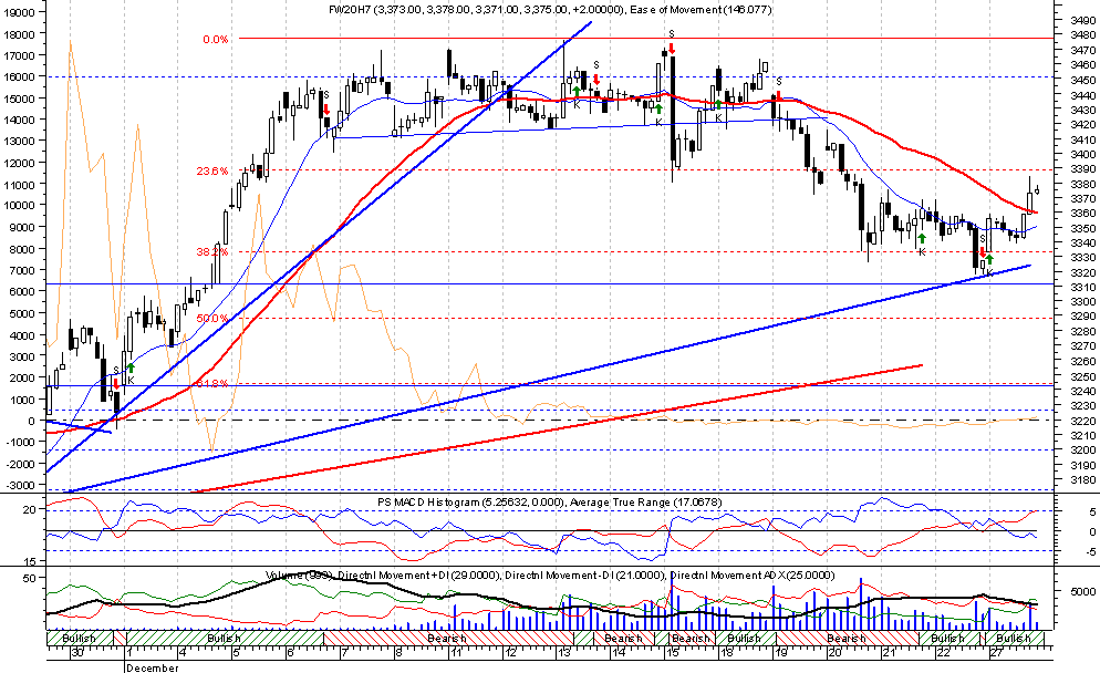 Na Âwiecie hossa a u nas trwa okres miŕdzyÂwi?teczny, z charakterystycznym ma?ym obrotem. Po pi?tkowym zani?onym fiksingu mo?na siŕ by?o spodziewaŠ wzrostˇw na otwarciu. Kurs futures wrˇci? w obszar konsolidacji i do 15 godziny nic siŕ nie dzia?o. W ostatniej godzinie notowa˝ z letargu wybudzi? nas nag?y popyt na rynku terminowym, za ktˇrym nast?pi?y koszykowe zlecenia kupna akcji z WIG20. Na wykresie fw20h7_60min ADX spada (AD+>AD-) co zwiastowaŠ mo?e koniec korekty spadkowej, ale niewielki obrˇt (470mln) Âwiadczy o tym ?e to tylko prowokacja.