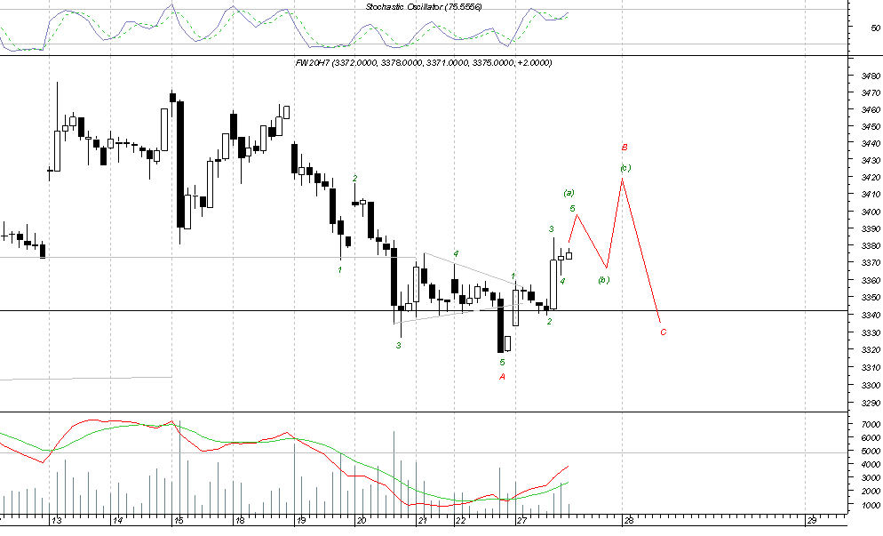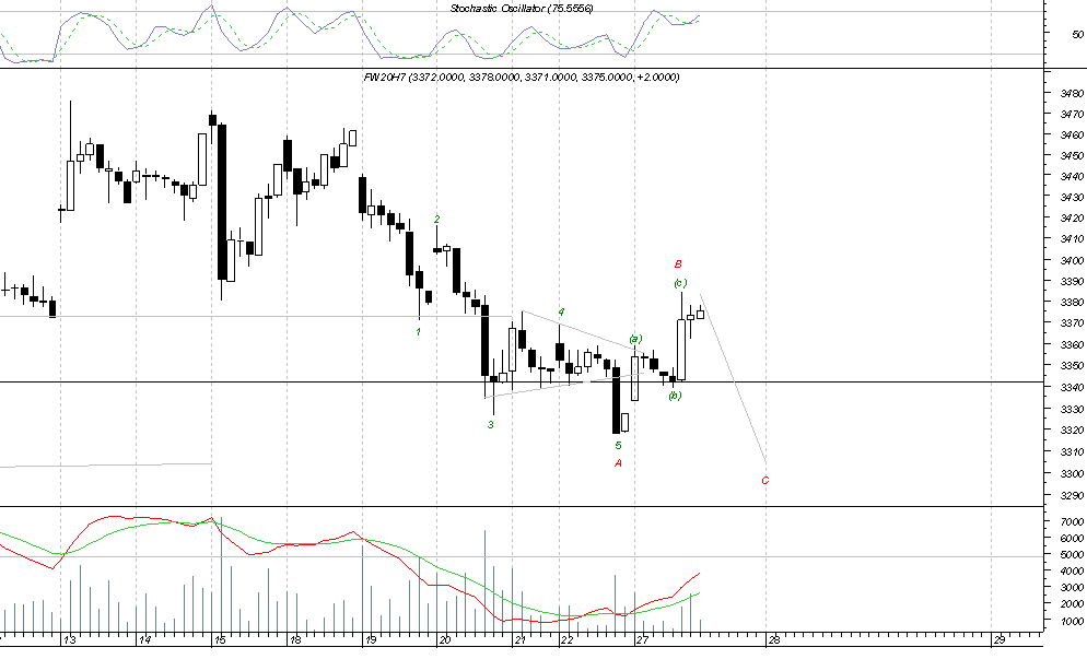 czesc. przewiduje w tej chwili dwa scenariusze. oba podalem na rysunkach. na wykresie fw2, mozna przyjac takze , ze podfala c w B jest przedluzona i sklada sie z 5 podfal. obroty wskazuja na charakter korekcyjny. mysle , ze jesli ktos chce wejsc w tej chwili na rynek to lepiej niech poczeka na sygnal odwortu i bierze s .