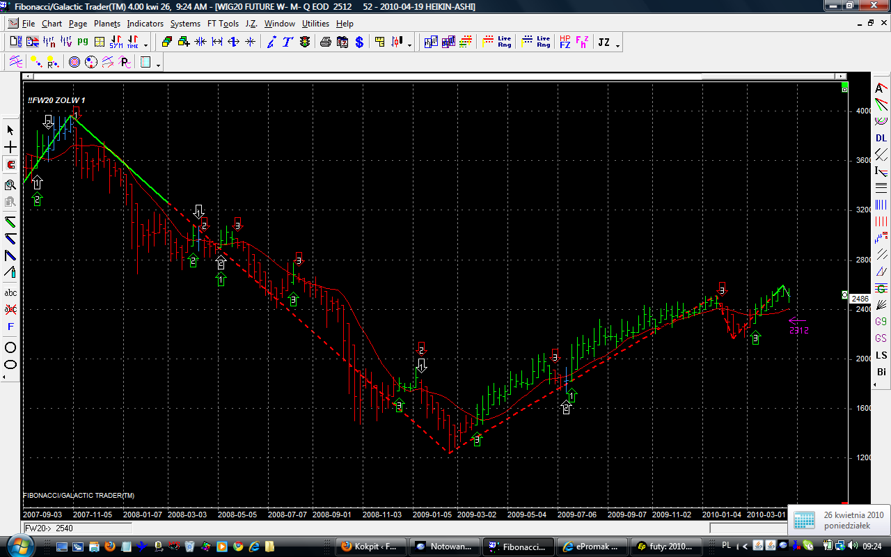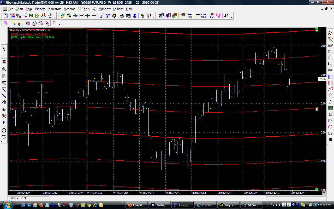 Na liniach Marsa mamy zapowiadane dojście do wsparcia wyznaczonego jedną z linii Marsa. Jeżeli tu się zatrzymamy, to spadek będzie można uznać za mało znaczący (jedno piętro) i spodziewać się można ponownego ataku na szczyt.