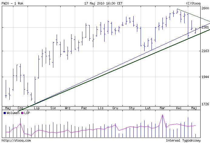 Początek minionego tygodnia na rynkach dostosował się do życzeń Aleksandra Grada i zafundował nam odbicie pod debiut PZU. Kto wie czy gdyby nie powrót nerwowości na rynki akcje naszego tuza nie odwiedziłyby 370zł. Jednak od czwartku na rynek powrócił niepokój. Euro kontynuuje rajd w dół po poniedziałkowym wyskoku który w ten sam dzień został zniwelowany. Złotówka również pozostaje bardzo słaba i po piątkowym zachowaniu rynków powraca obraz rynku który mieliśmy od początku miesiąca. Rynku rozchwianego niepewnego na którym jedynym atrakcyjnym aktywem jest dolar i złoto które dosłownie z dnia na dzień bije rekordy.Strumień pieniędzy kieruje się w bardzo wąski obszar i musimy się z tym pogodzić, że nasza waluta mimo, że jesteśmy tak silną na ten moment gospodarką w Europie będzie mocno tracić. Ciekawostką jest plotka jaka pojawiła się w prasie odnośnie porozumienia w sprawie pomocy dla Grecji. "El Pais" powołując się na wypowiedź premiera Hiszpanii José Luisa Rodrigueza Zapatero pisze, że "Sarkozy zaczął walić pięścią w stół i grozić opuszczeniem strefy euro. (...) Zmusiło to kanclerz Niemiec Angelę Merkel do ustąpienia i osiągnięcia porozumienia". To pokazuje jakie jest napięcie w strefie Euro i na pewno nie stawia jej w dobrym świetle.