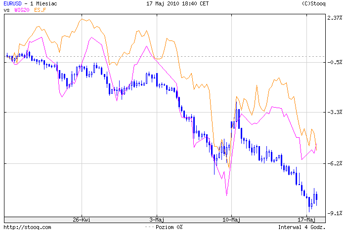 Początek minionego tygodnia na rynkach dostosował się do życzeń Aleksandra Grada i zafundował nam odbicie pod debiut PZU. Kto wie czy gdyby nie powrót nerwowości na rynki akcje naszego tuza nie odwiedziłyby 370zł. Jednak od czwartku na rynek powrócił niepokój. Euro kontynuuje rajd w dół po poniedziałkowym wyskoku który w ten sam dzień został zniwelowany. Złotówka również pozostaje bardzo słaba i po piątkowym zachowaniu rynków powraca obraz rynku który mieliśmy od początku miesiąca. Rynku rozchwianego niepewnego na którym jedynym atrakcyjnym aktywem jest dolar i złoto które dosłownie z dnia na dzień bije rekordy.Strumień pieniędzy kieruje się w bardzo wąski obszar i musimy się z tym pogodzić, że nasza waluta mimo, że jesteśmy tak silną na ten moment gospodarką w Europie będzie mocno tracić. Ciekawostką jest plotka jaka pojawiła się w prasie odnośnie porozumienia w sprawie pomocy dla Grecji. "El Pais" powołując się na wypowiedź premiera Hiszpanii José Luisa Rodrigueza Zapatero pisze, że "Sarkozy zaczął walić pięścią w stół i grozić opuszczeniem strefy euro. (...) Zmusiło to kanclerz Niemiec Angelę Merkel do ustąpienia i osiągnięcia porozumienia". To pokazuje jakie jest napięcie w strefie Euro i na pewno nie stawia jej w dobrym świetle.