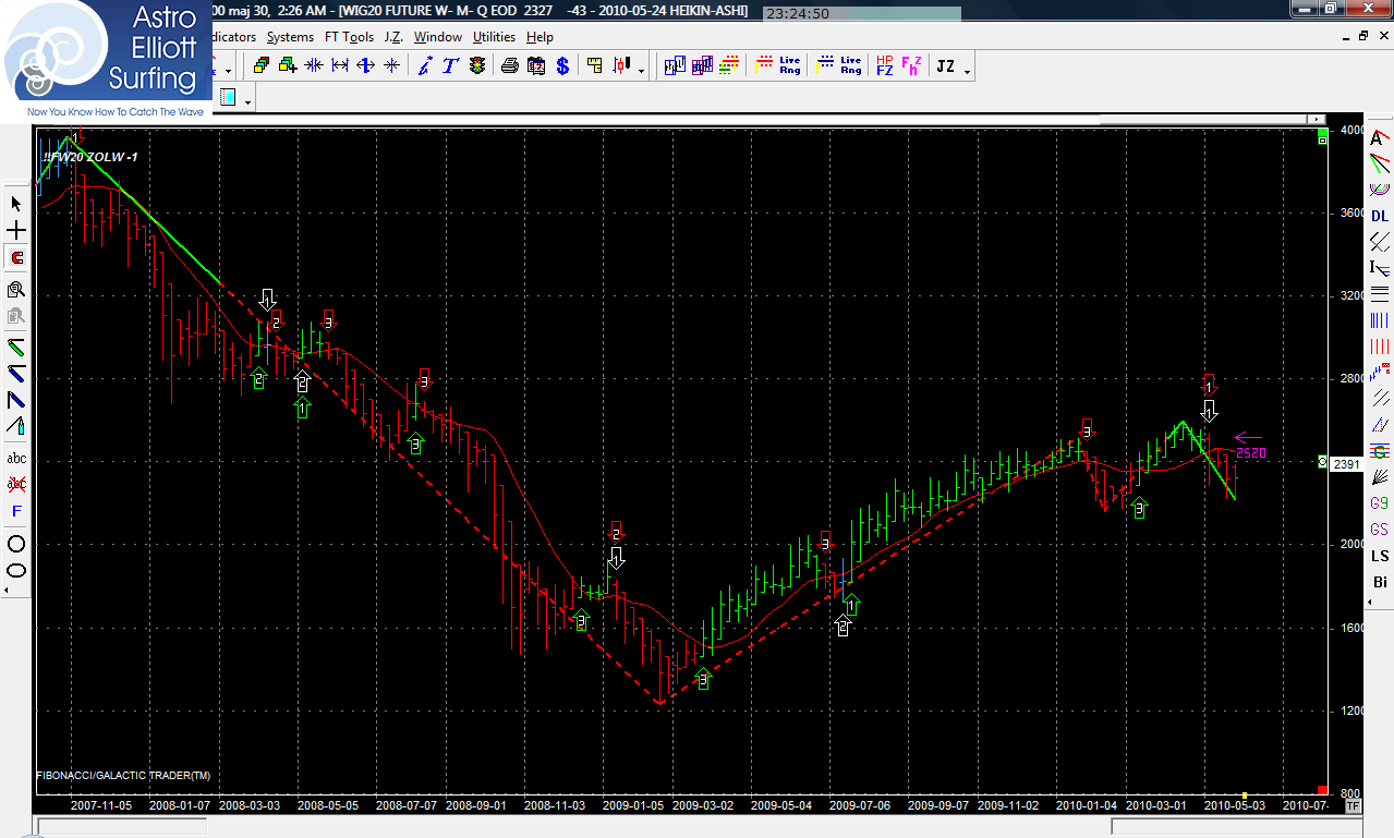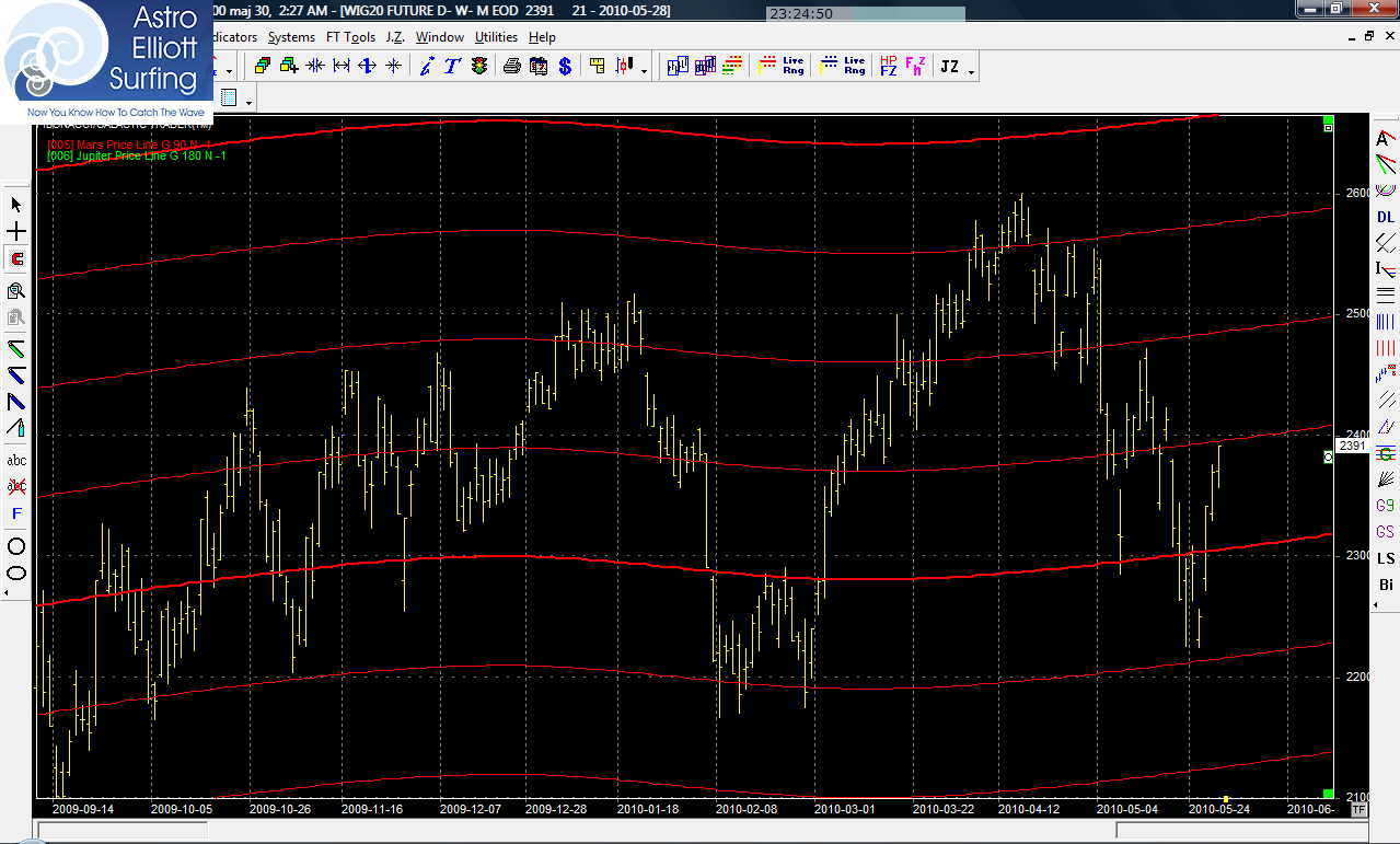 Jak widać na wykresie rynek wykonał dokładnie taki ruch jak prognozowałem. Udany powtórny test dołka spowodował wzrosty o dwa pietra. Obecnie jesteśmy znowu przy oporach ale już wyżej. Tu historia powinna się powtórzyć ale w drugą stronę. Jeżeli opór pokonamy to następna linia Marsa przebiega w okolicach 2480-90 pkt. Jeżeli test będzie nieudany to odbicie trzeba traktować jako korekcyjne w dalszych spadkach.