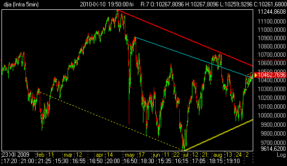 DJIA powoli i ociężale, ale systematycznie dochodzi do swojej spadkowej (czerwona).
