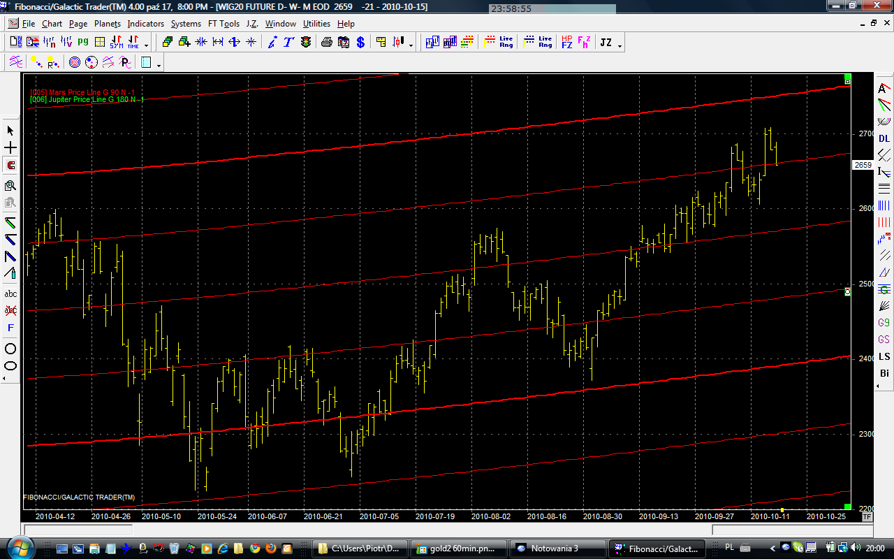 Przeczucia mnie nie myliły. Byki podjęły próbę sforsowania oporu na poziomie 2650 pkt ale próba ta nie powiodła się na razie. Mamy odejście pod linię oporu, która teraz znajduje się na poziomie 2660pkt. Linie Marsa są wznoszące i to działa na korzyść byków, gdyż pierwsze wsparcie znajduje się również wyżej, tj. na poziomie 2580 pkt. Idealnym scenariuszem byłoby dojście do tego wsparcia i wyprowadzenie kolejnego, tym razem skutecznego, ataku. Za takim scenariuszem przemawia dalsza hossa na niektórych metalach i towarach - patrz miedź i złoto, oraz osłabiający się dolar.