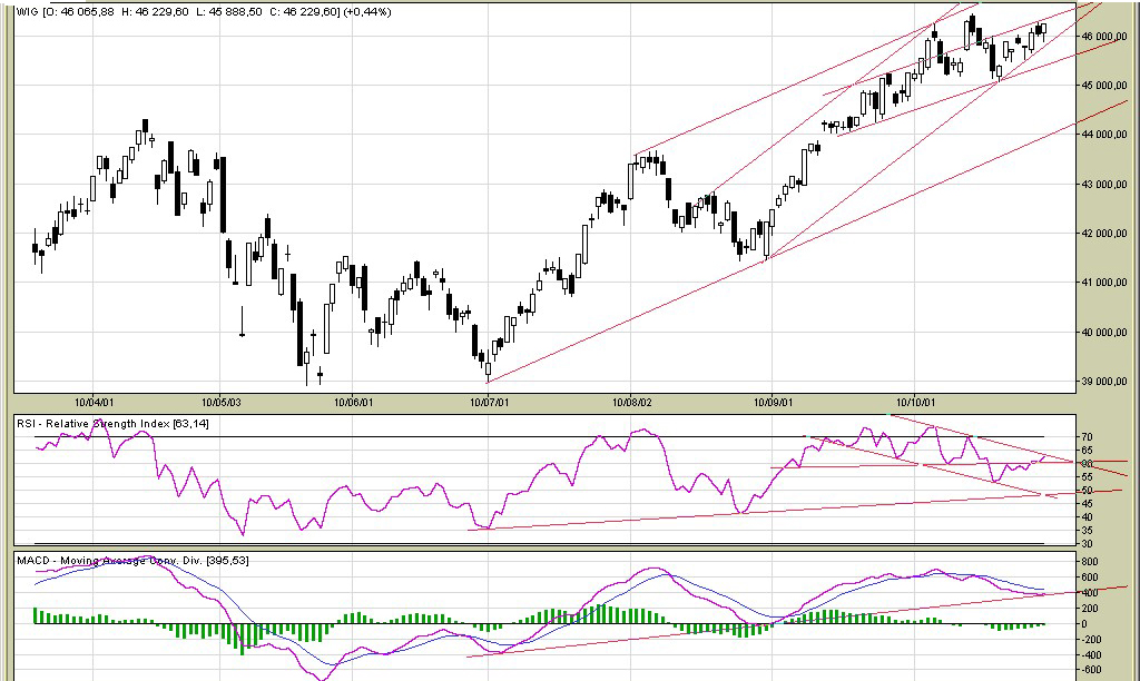 No nic, wszedłem wczoraj na przerywanej. Według mnie na przyszły tydzień raczej wzrosty. S&P się trochę wychłodził i 2 razy odbił od ograniczenia kanału. Ew. można poczekać na wybicie z takiego małego niby oRGRa, choć dla mnie taka formacja nie poprzedzona spadkami, jest zupełnie niewiarygodna. Liczę na powtórkę z 5 października. Wykres na 4h: