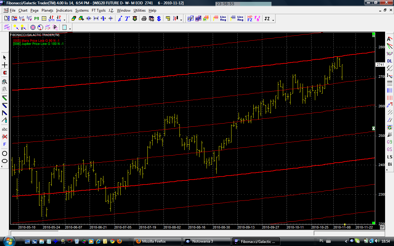 Na wykresie z liniami Marsa widać sporo atrakcji. Mieliśmy dojście do poważnego oporu na linii Marsa praktycznie w punkt, a następnie solidną czapę, która zakończyła się w okolicach wsparcia na niższej linii, już nie tak dokładnie. Teraz sytuacja jest niejasna i o przyszłym ruchu zadecyduje przebicie którejś z tych linii. Trudno mi orzec, która to będzie ale trend jest nadal wzrostowy. Logicznym jest wiec założenie, że będzie to linia oporu. Jeżeli stanie się inaczej to ruch spadkowy nasili się niewątpliwie.