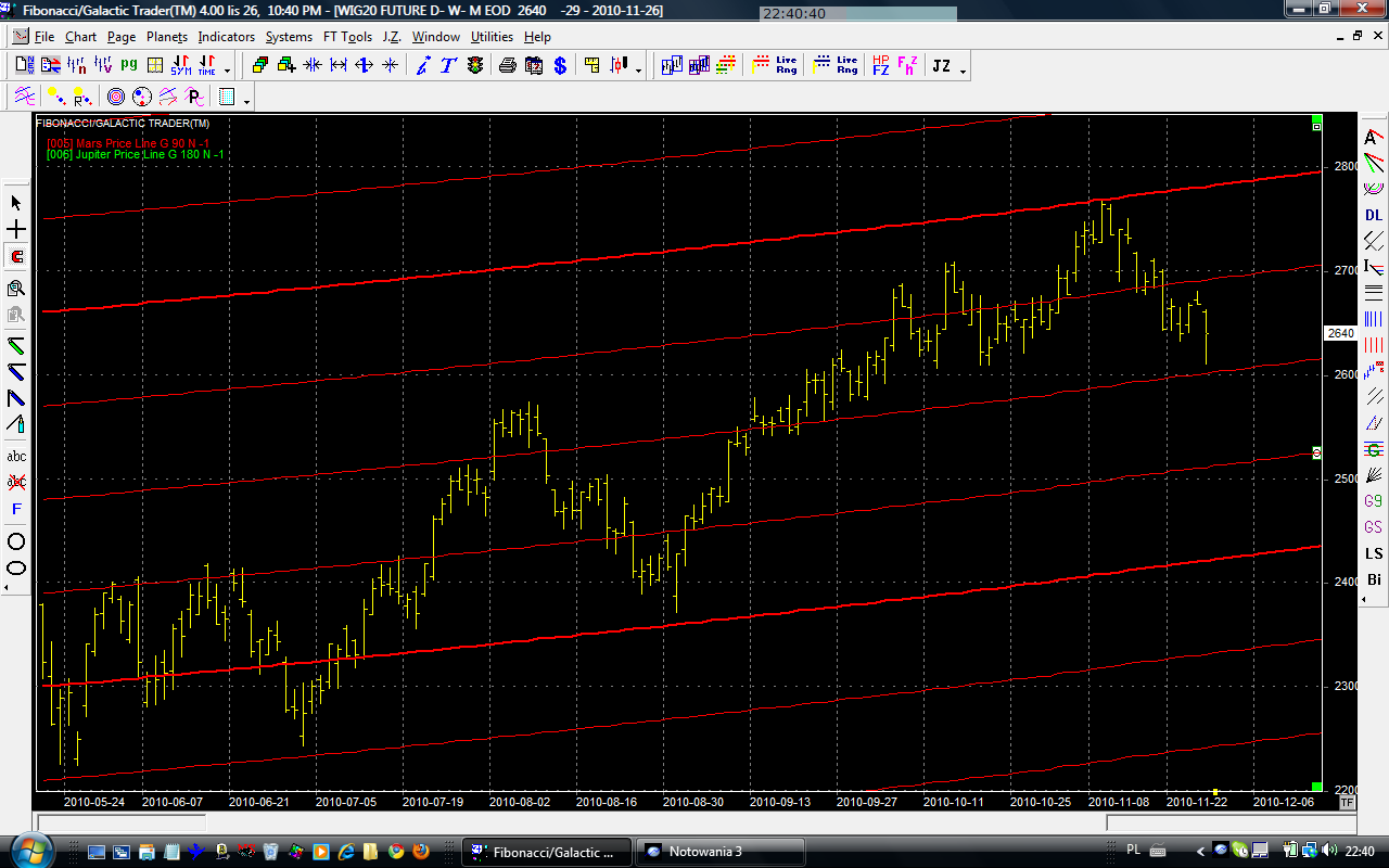 Tak kończyłem zeszłotygodniowy komentarz. Dzisiejsze minimum sesji to... 2610. Co dalej? Mamy dwa piętra linii Marsa za sobą i wydaje mi się, że na razie wystarczy. Sądzę, że spróbujemy odbić przynajmniej w okolice 2700. Krytycznym elementem jednak jest utrzymanie wsparcia na linii Marsa przebiegającej obecnie w okolicach 2620 pkt. Jeżeli to się nie uda będzie na prawdę źle.