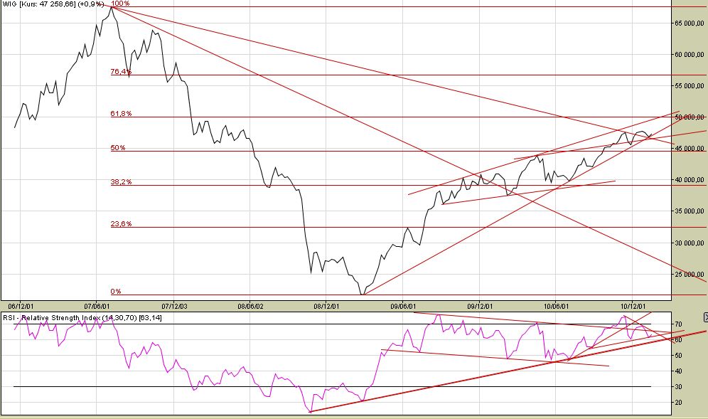 Wczorajsza konsolidacja Wig20 na wykresie intra oznacza póki co proporzec flagi, co przy ewentualnych dalszych wzrostach W USA, powinno przynieść u nas dynamiczną pogoń za tamtymi indeksami (tam maksy, u nas dopiero zniesienie 61,8 ostatnich spadków).